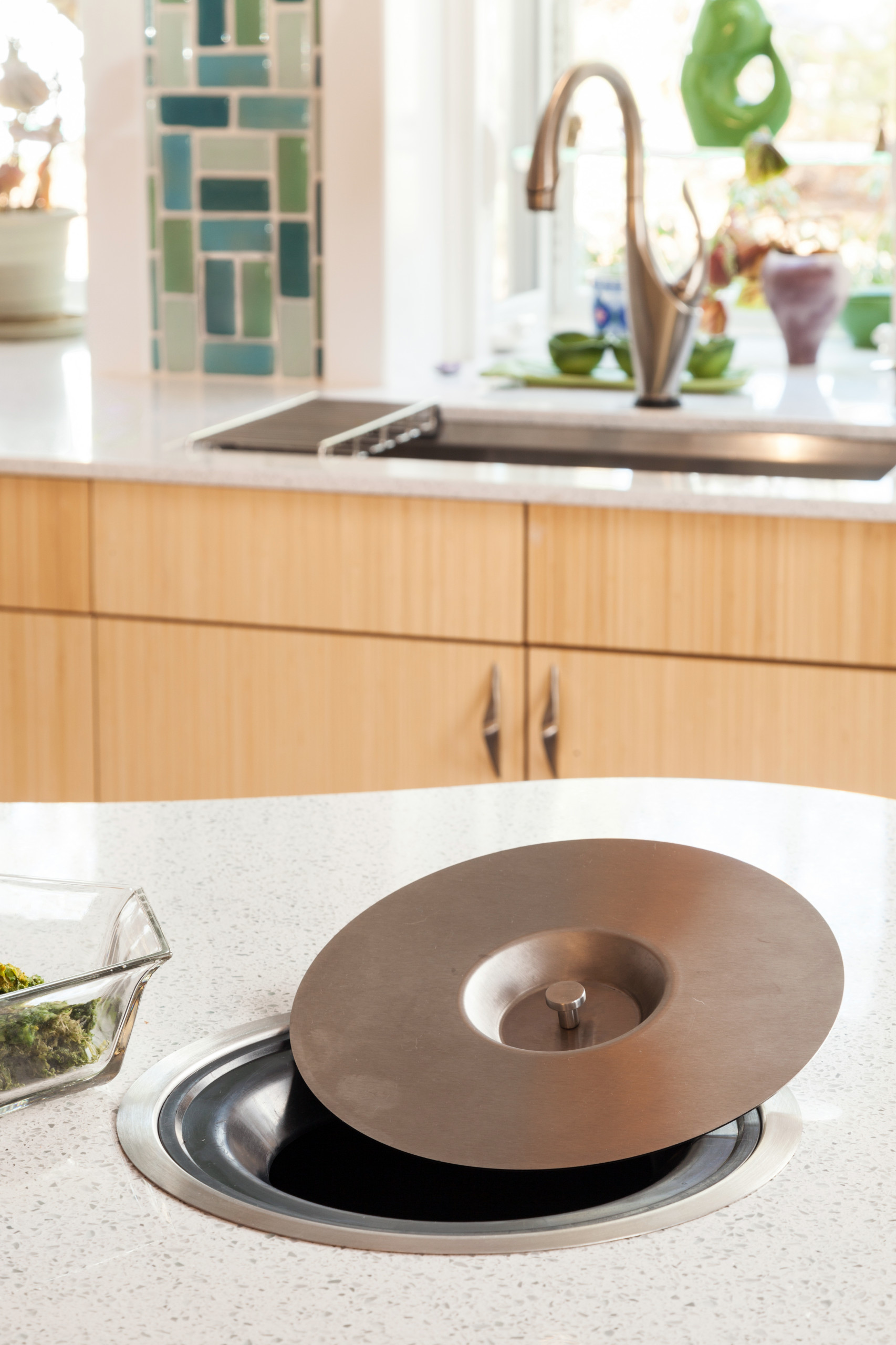 Dans cette petite cuisine, il restait la poubelle à caser et Aurore Pannier, l’architecte d’intérieur en charge du projet, s’était fait un défi de ne pas la poser au milieu de l’espace. Elle a trouvé une solution assez inédite : « Vous voyez le petit rond à droite dans le plan de travail, c’est elle ! Un clapet caoutchouteux sous lequel un collier maintient un sac-poubelle permet de jeter les épluchures et les restes de cuisine. Le sac est caché dans un logement accessible sous le plan bar. »