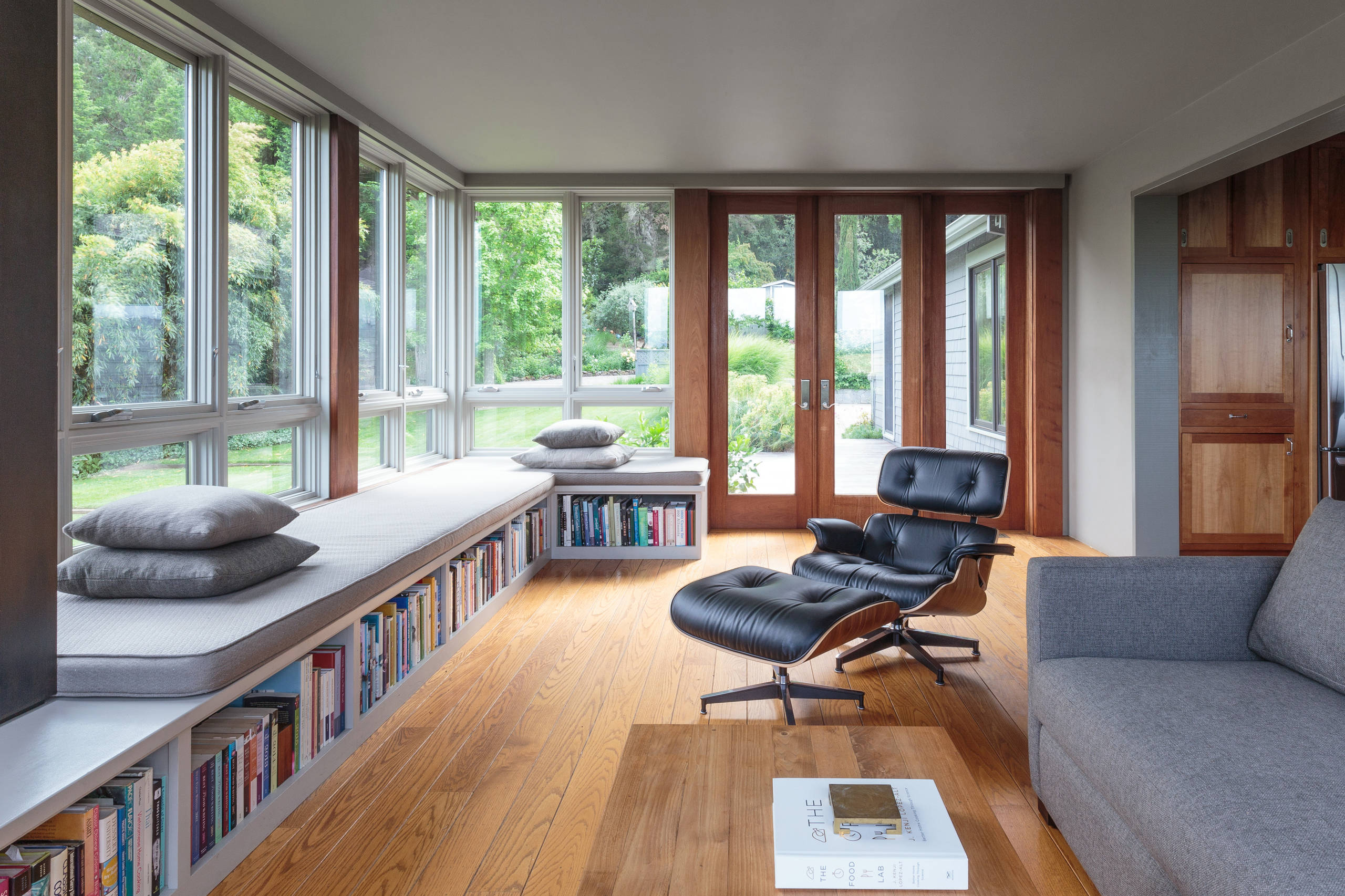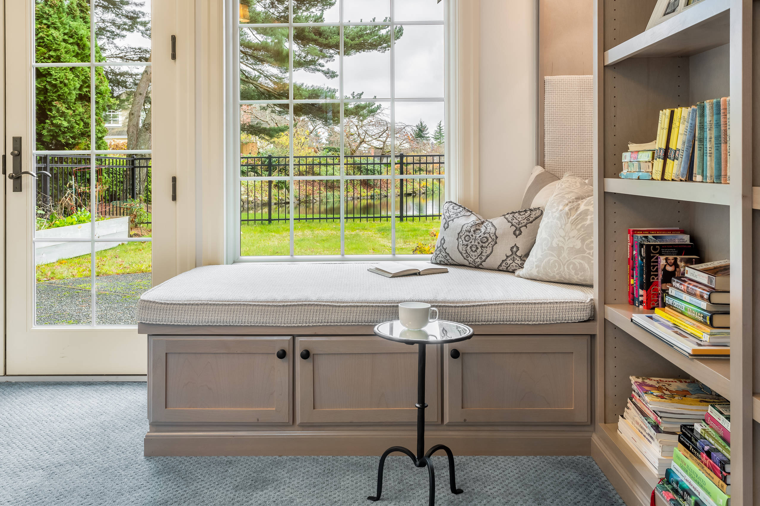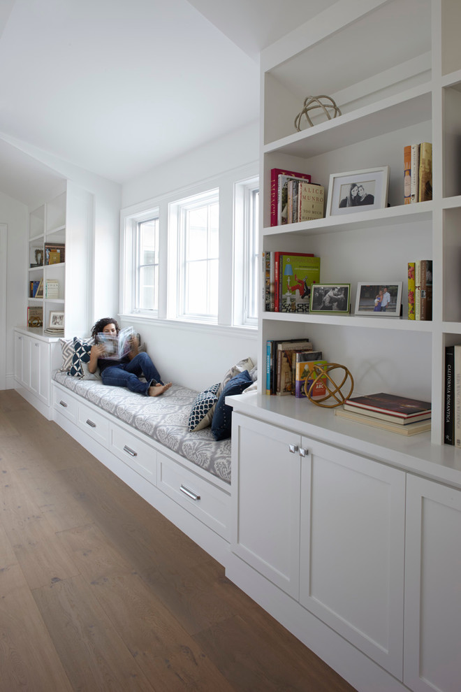 L’aménagement d’une bibliothèque assortie d’un coin lecture est tout aussi réalisable dans un stye classique. La preuve avec ce salon particulier dédié aux parents sur l’île Mercer, près de Seattle. Aménagé en L, le meuble bibliothèque intègre une méridienne qui dissimule d’autres espaces de rangement fermés sous son matelas.