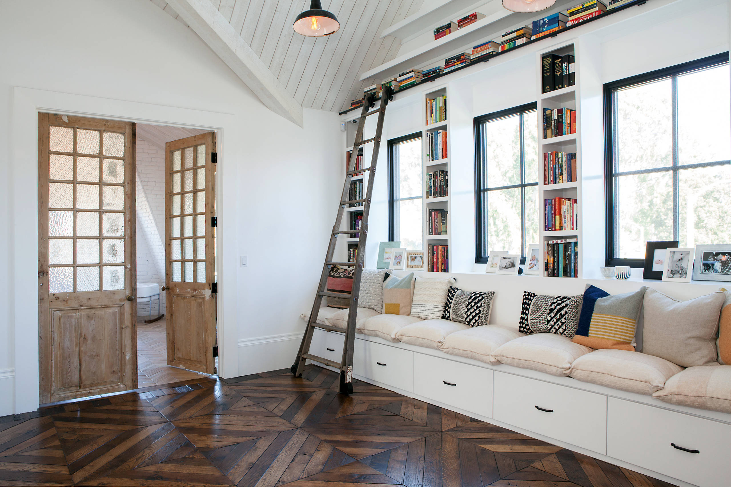 Dans cette maison de campagne proche de Los Angeles, la banquette de lecture est positionnée devant les étagères de livres. Aménagée sur plusieurs mètres de long, elle peut accueillir plusieurs lecteurs en même temps ! Conçu dans le même matériau que les étroites étagères verticales, le long banc à multiples tiroirs offre des rangements supplémentaires. Recouverte de coussins décoratifs, l’interminable banquette profite pleinement de la lumière naturelle.
