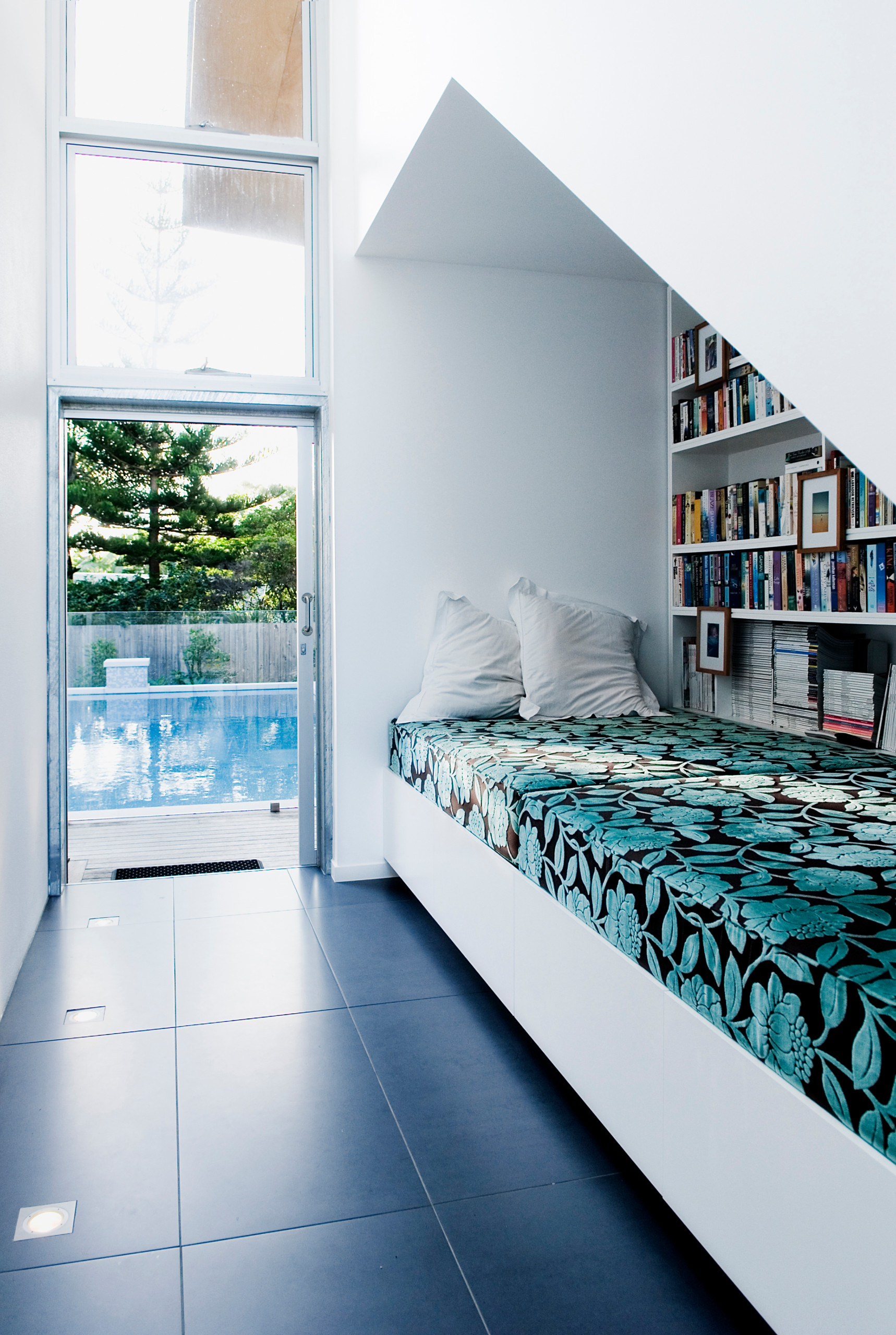 Dans cette villa australienne de bord de mer, bibliothèque et banquette ne font qu’une sous l’escalier. On peut voir ici aussi que les bibliothèques ne sont plus obligatoirement dédiées à occuper un pan de mur de salon, mais qu’elles s’installent aisément un peu partout, même dans les espaces les moins visibles.