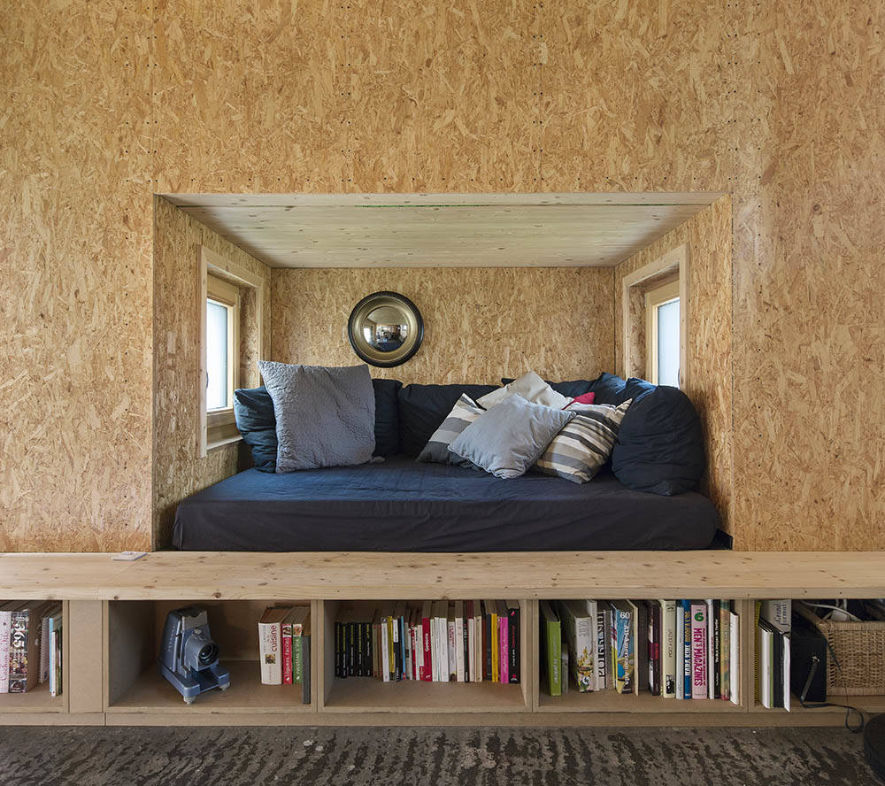 Dans cette charmante tiny house toute en longueur, à Portland, on a choisi de délimiter la partie séjour de l’espace nuit avec une cloison-bibliothèque intégrée. Si cette dernière sépare, le coin lecture, lui, réunit ! Trois modules blancs ont été ajoutés de longueur ou largeur similaire à l’espace devant la bibliothèque. Ils accueillent des sofas pour lire en famille.