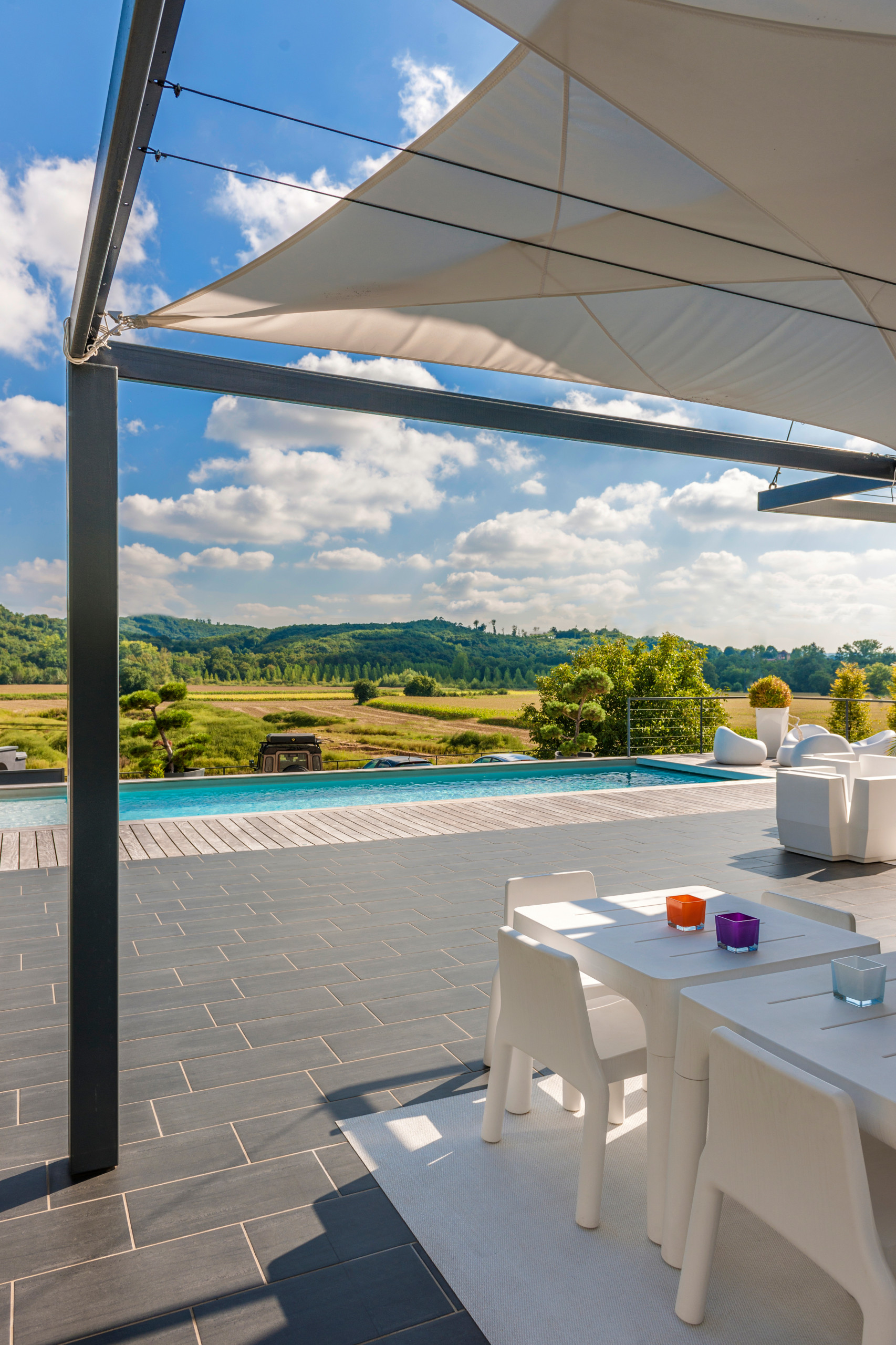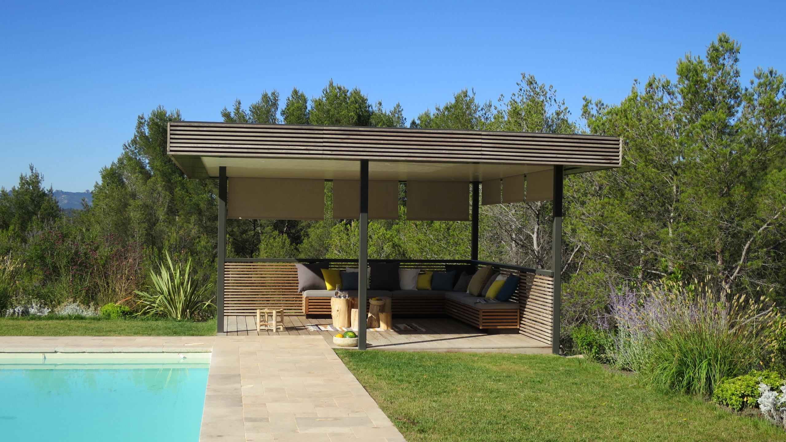 Il est parfait pour aménager un coin salon permanent au bord de la piscine. Ici, des stores latéraux permettent de créer encore plus d’ombre et se relève pour ne pas priver l’espace des courants d’air rafraîchissants.