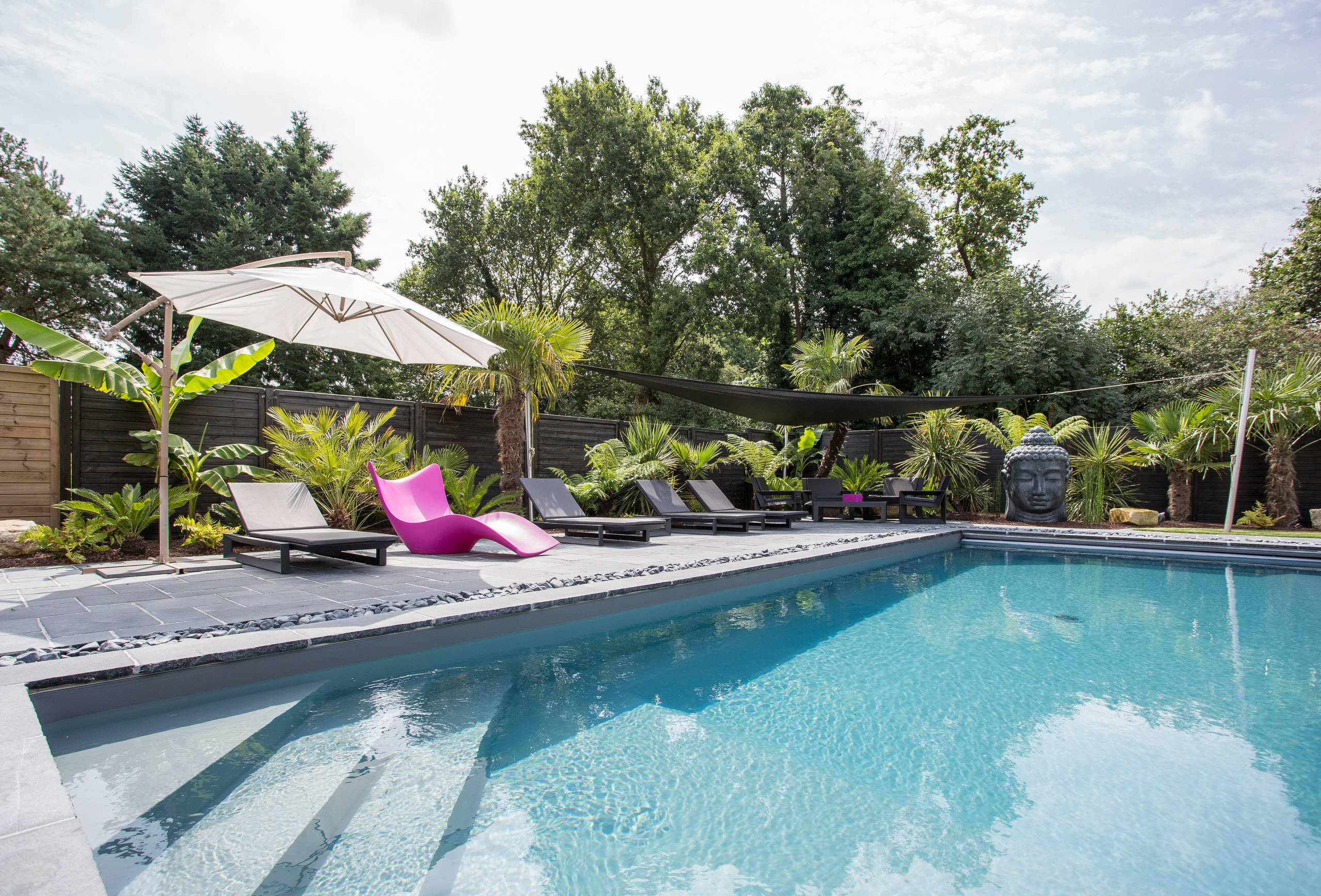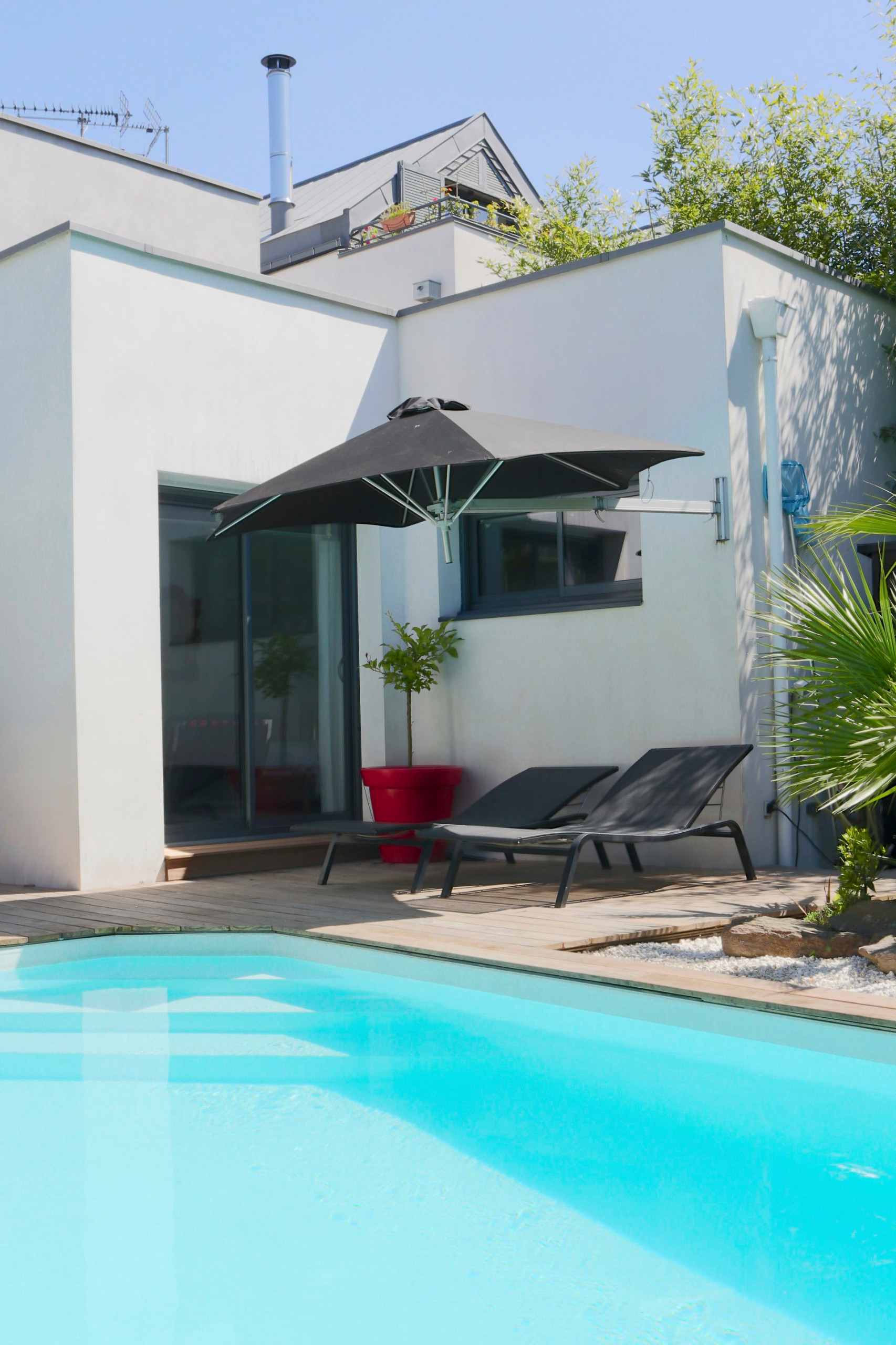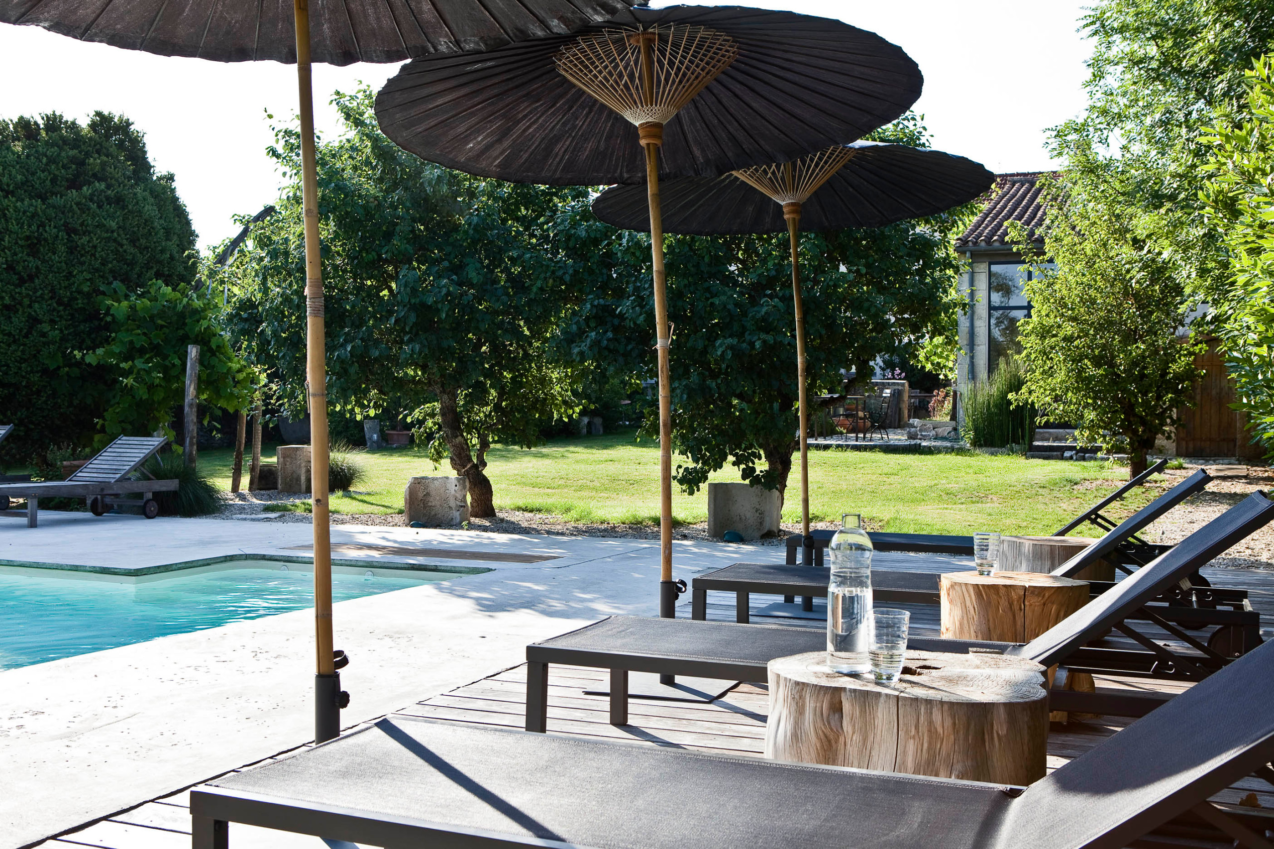 Ambiance resort du bout du monde avec ces ombrelles asiatiques qui ombragent chacune un lounger. Ce n’est sans doute pas le moyen le plus efficace de faire de l’ombre, car elles ne s’orientent pas et ont un faible diamètre, mais le dépaysement est parfait. Qui dirait en effet que ce jardin se trouve à Niort ?