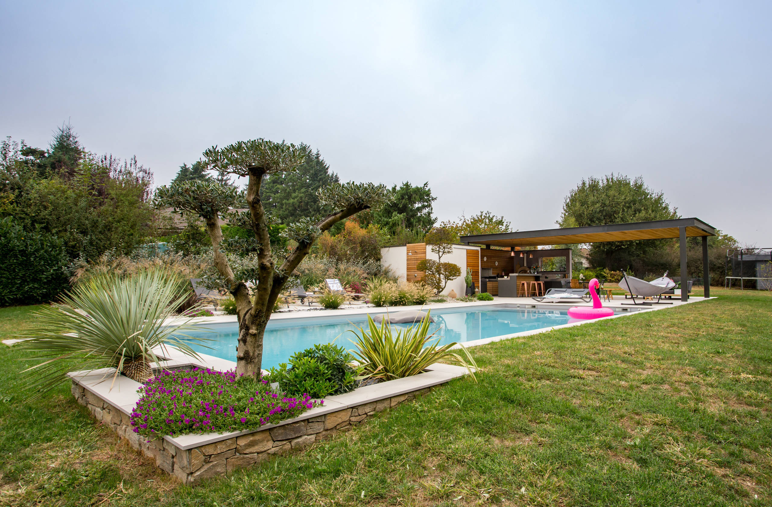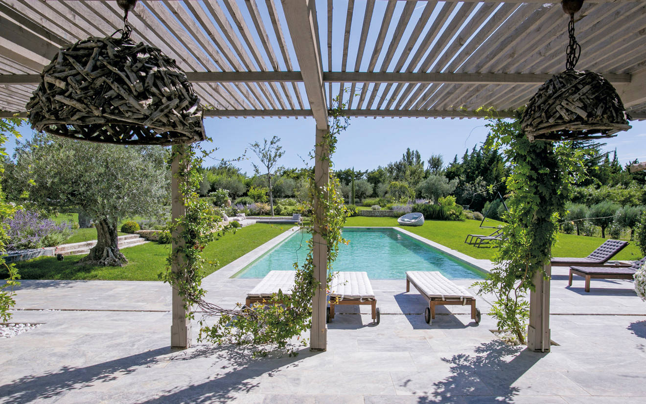 Le pool house est le local dédié à la « technique » de la piscine : pompe, chauffage de l’eau, filtration, produits d’entretien… Rien n’empêche d’imaginer un local plus grand pour s’en servir comme d’un abri pour changer. Flanqué d’un auvent ou d’une pergola, comme ici, il peut servir à ombrager…
