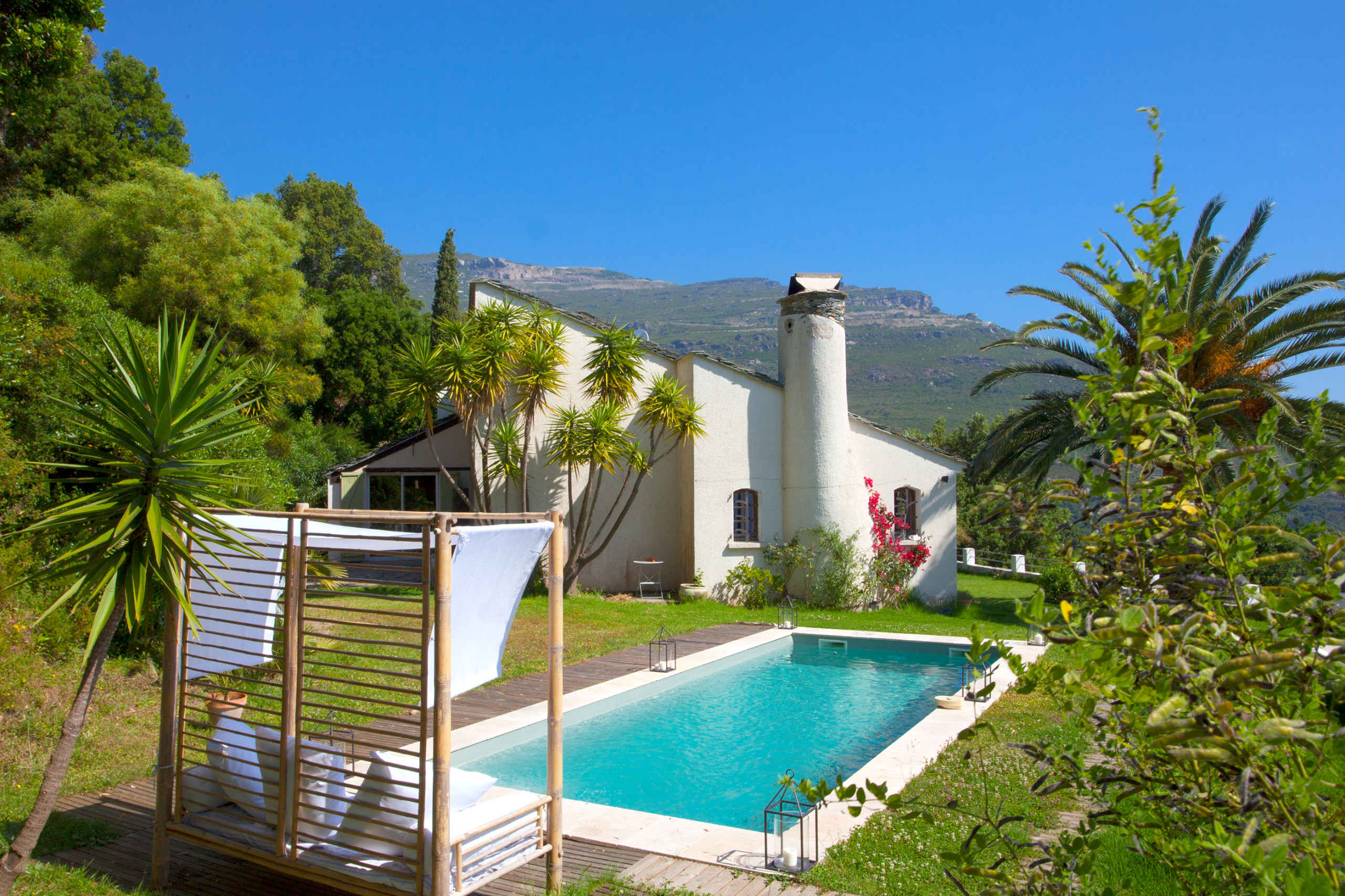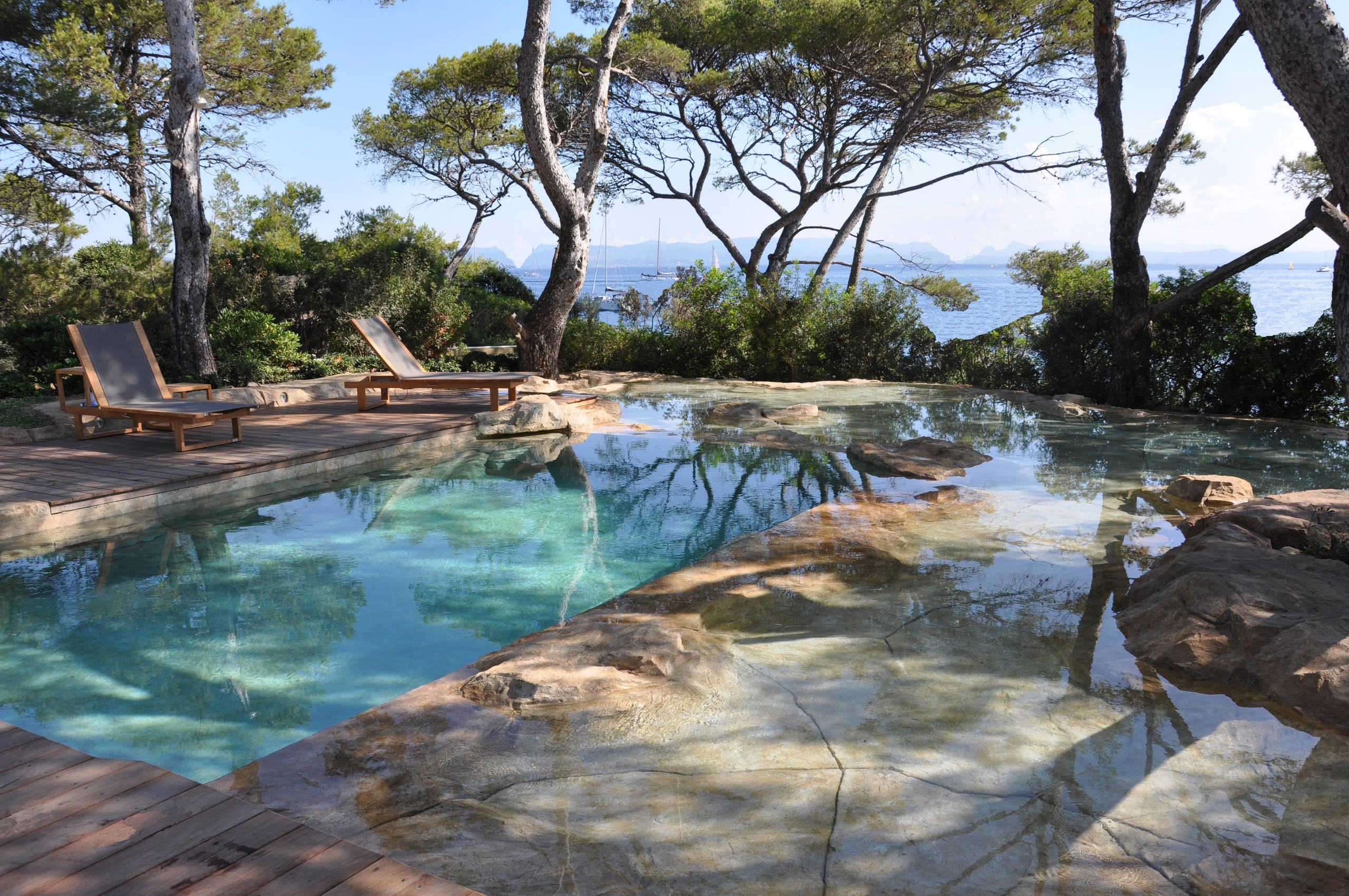 Les pins parasols procurent un magnifique ombrage paysager à cette piscine de Hyères. Cependant, les piscines ne font pas bon ménage avec les arbres qui perdront fatalement leurs épines ou feuilles dans l’eau et causeront un entretien accru… C’est donc la pire des solutions pour ombrager une piscine bien que ce soit sans aucun doute la plus belle…