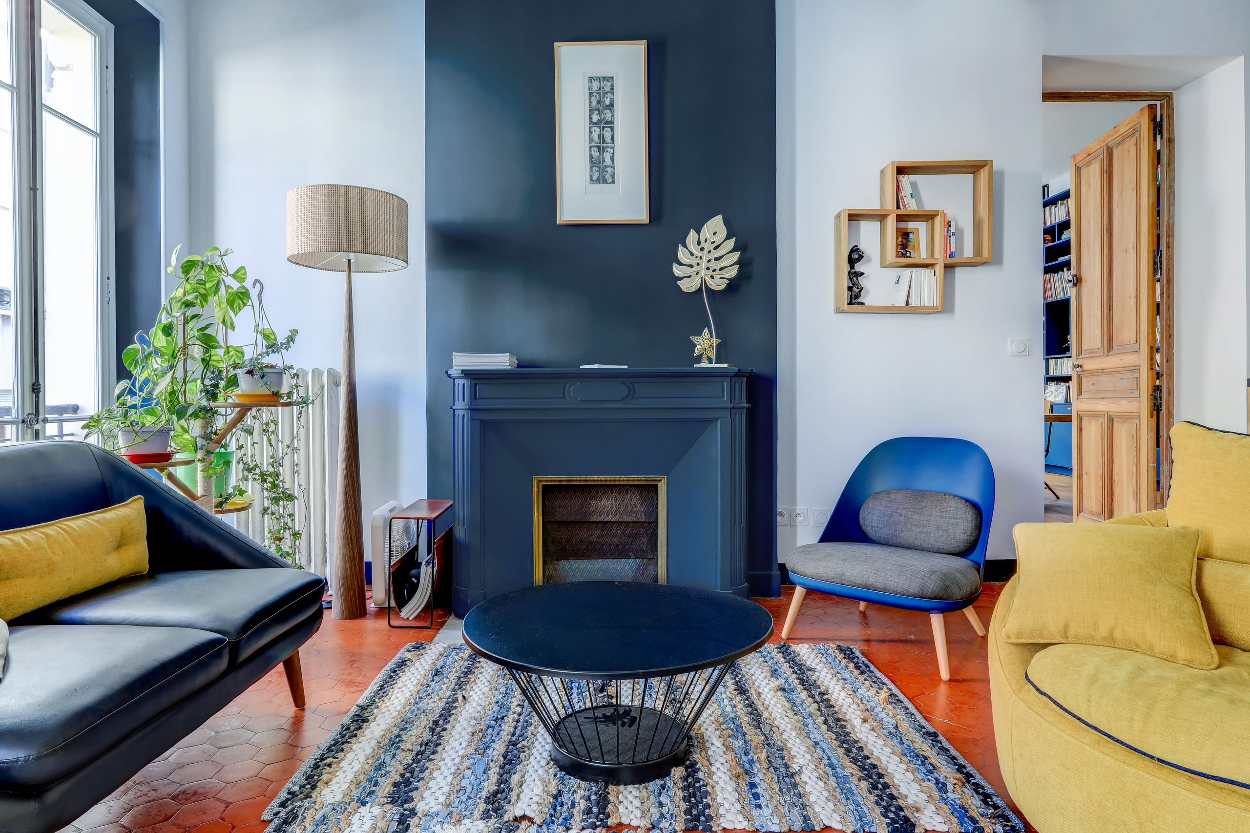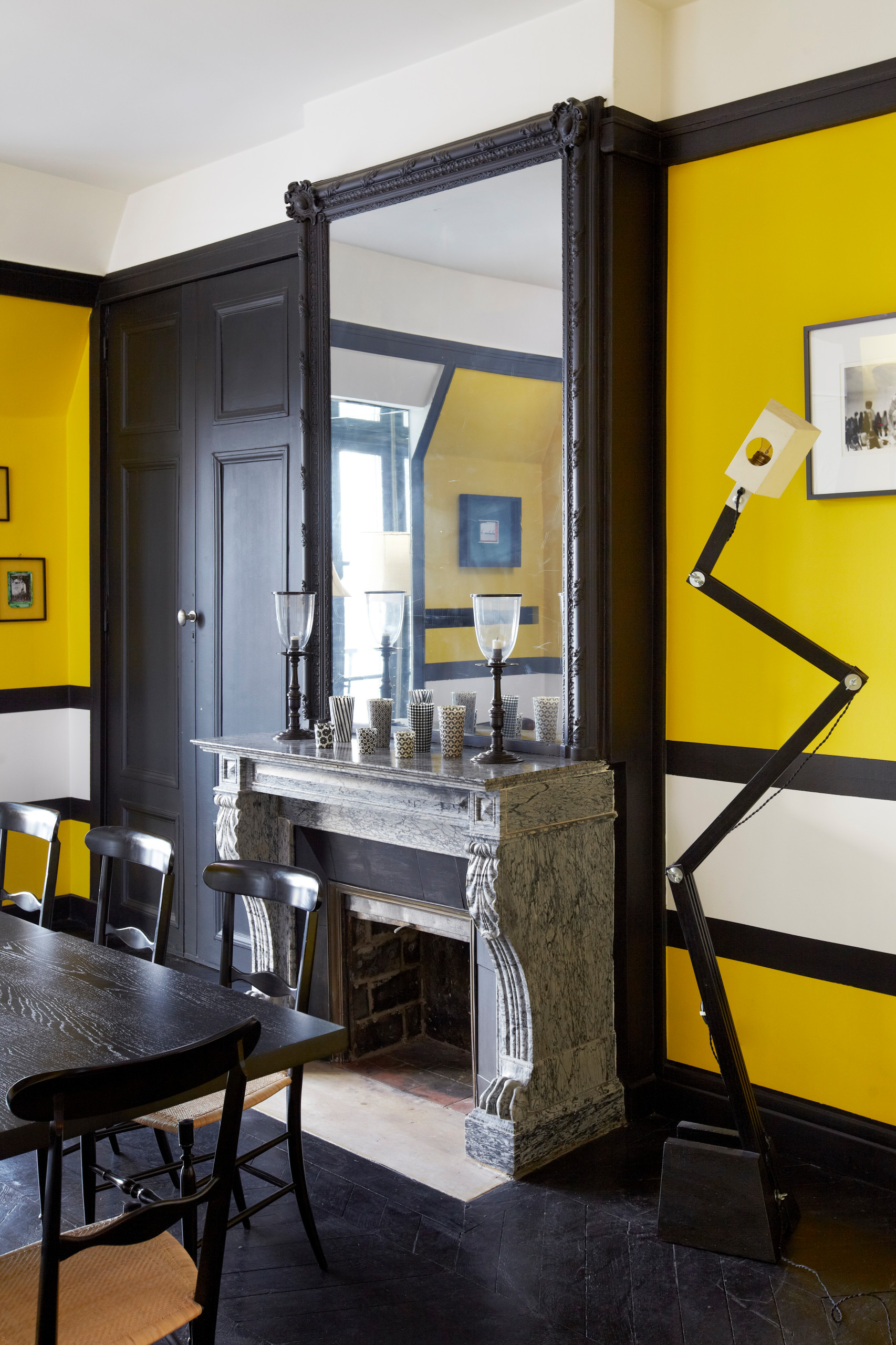 Et pourquoi ne pas faire de votre vieille cheminée l’atout design de la pièce en la peignant en… jaune fluo. Surmontée d’un tableau psychédélique à la place du classique miroir et accueillant une enceinte design sur son manteau, elle est devenue l’endroit où tous les regards se posent.