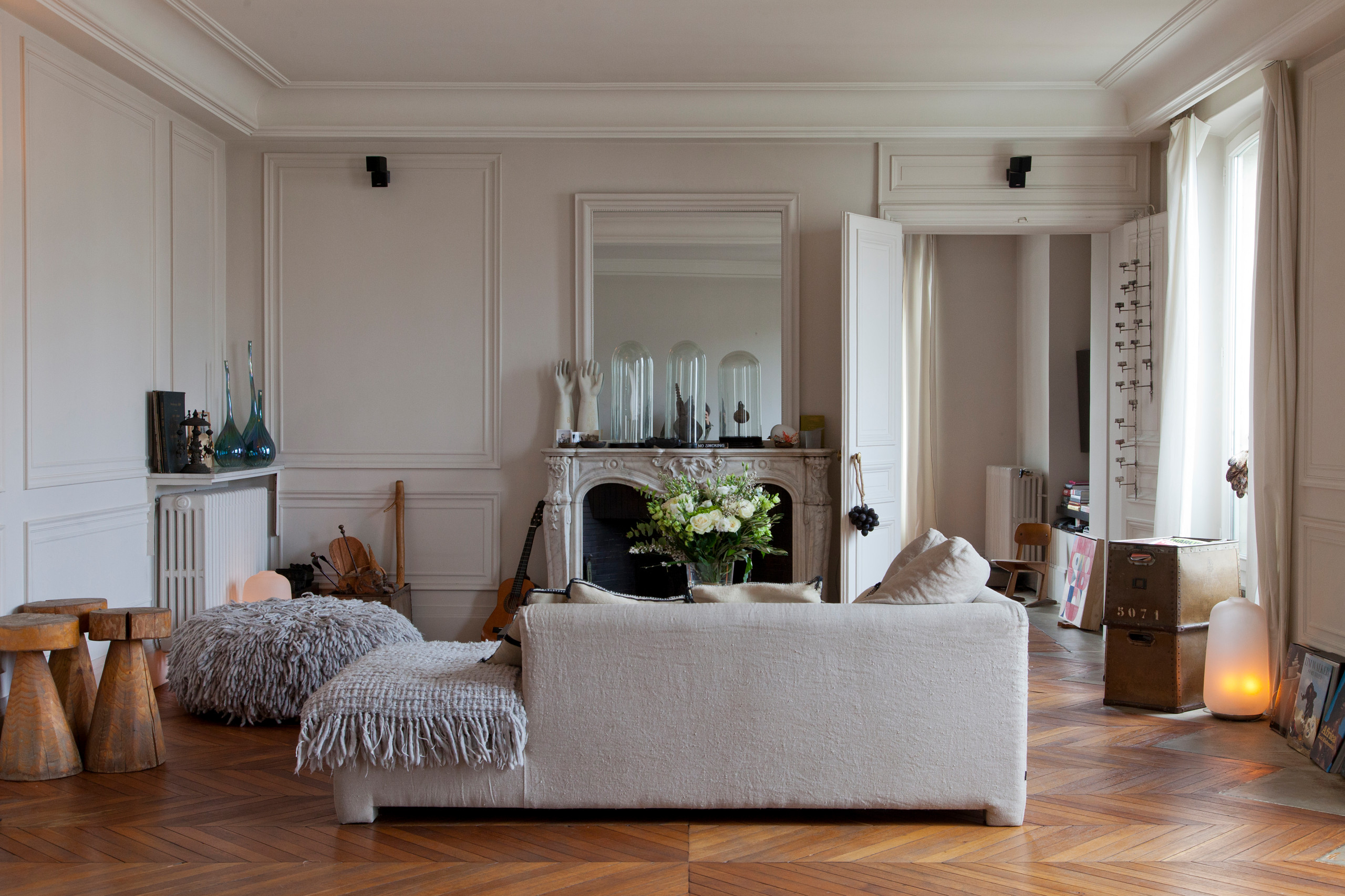 Pour moderniser un salon haussmannien avec cheminée de marbre blanc et cadre doré, n’hésitez pas à fondre ce dernier dans les murs en le repeignant en blanc. Laissez aux coussins le soin de faire des taches de couleur. Votre salon en paraîtra immédiatement modernisé.