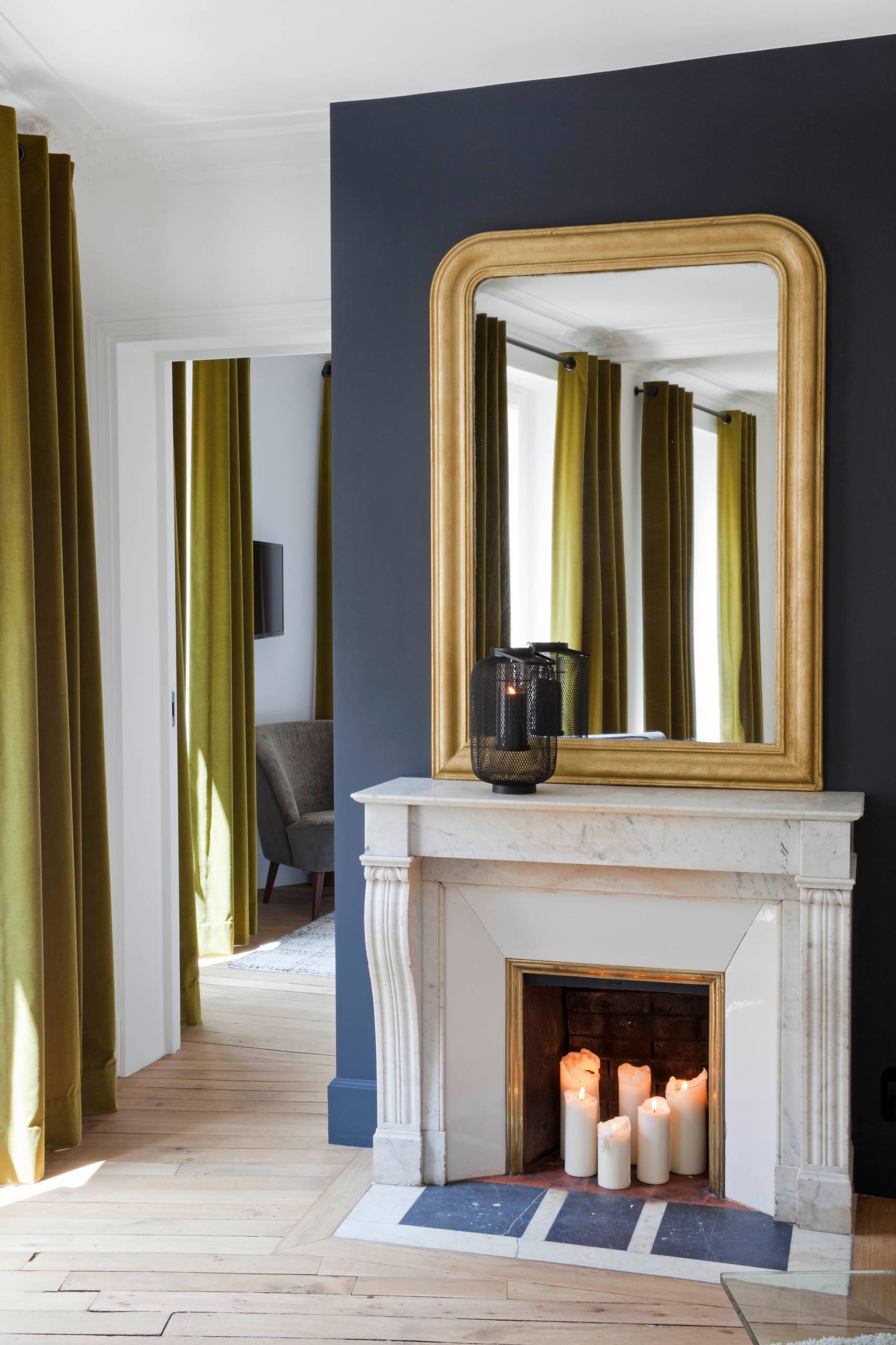 Si votre cheminée n’est pas fonctionnelle ou que vous ne pouvez pas vous en servir car la municipalité l’interdit, gardez son côté boîte à feu et faites-y brûler de grands cierges façon niche votive. Soignez l’habillage de la cheminée et le rendu sera parfait.