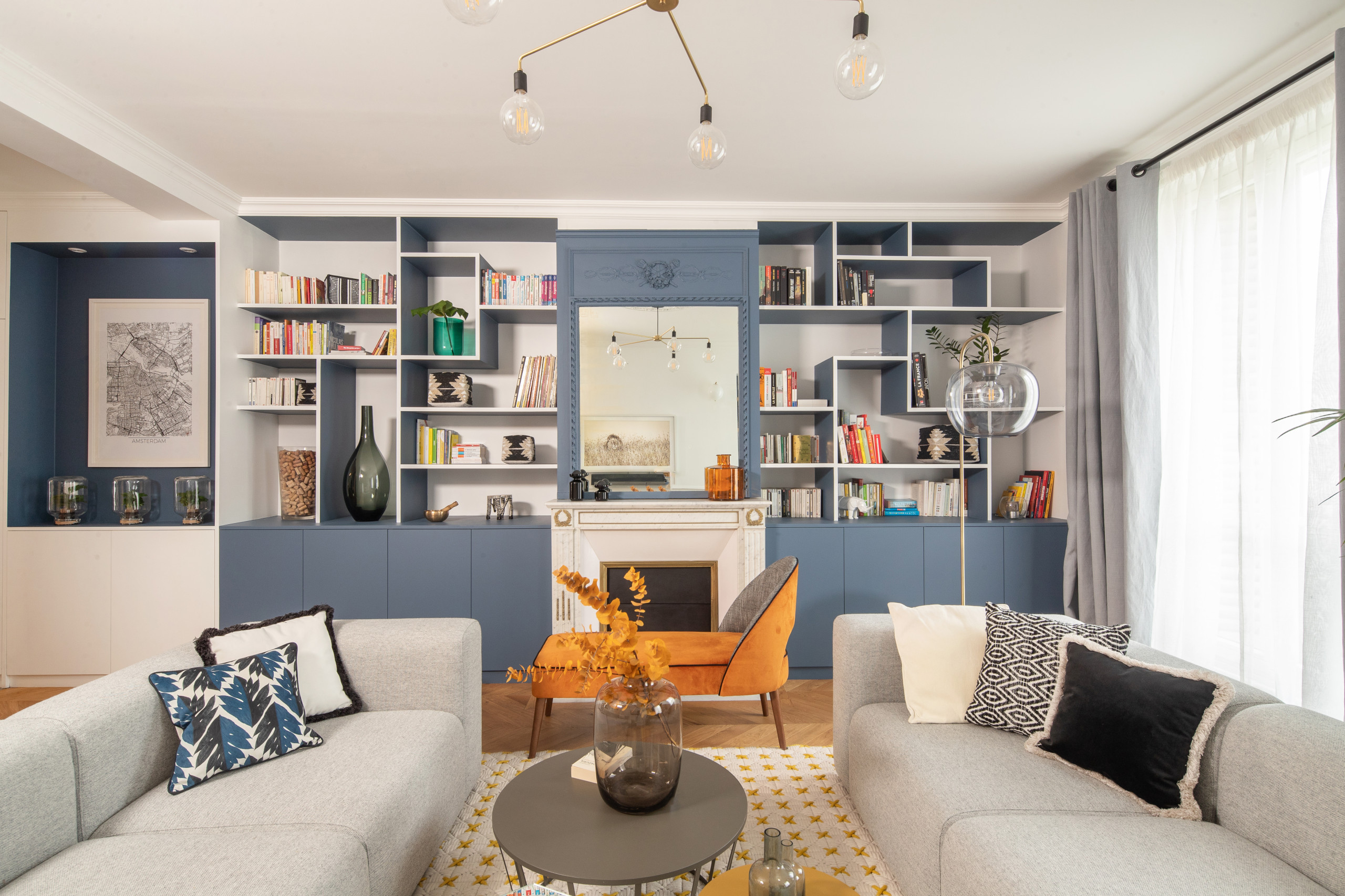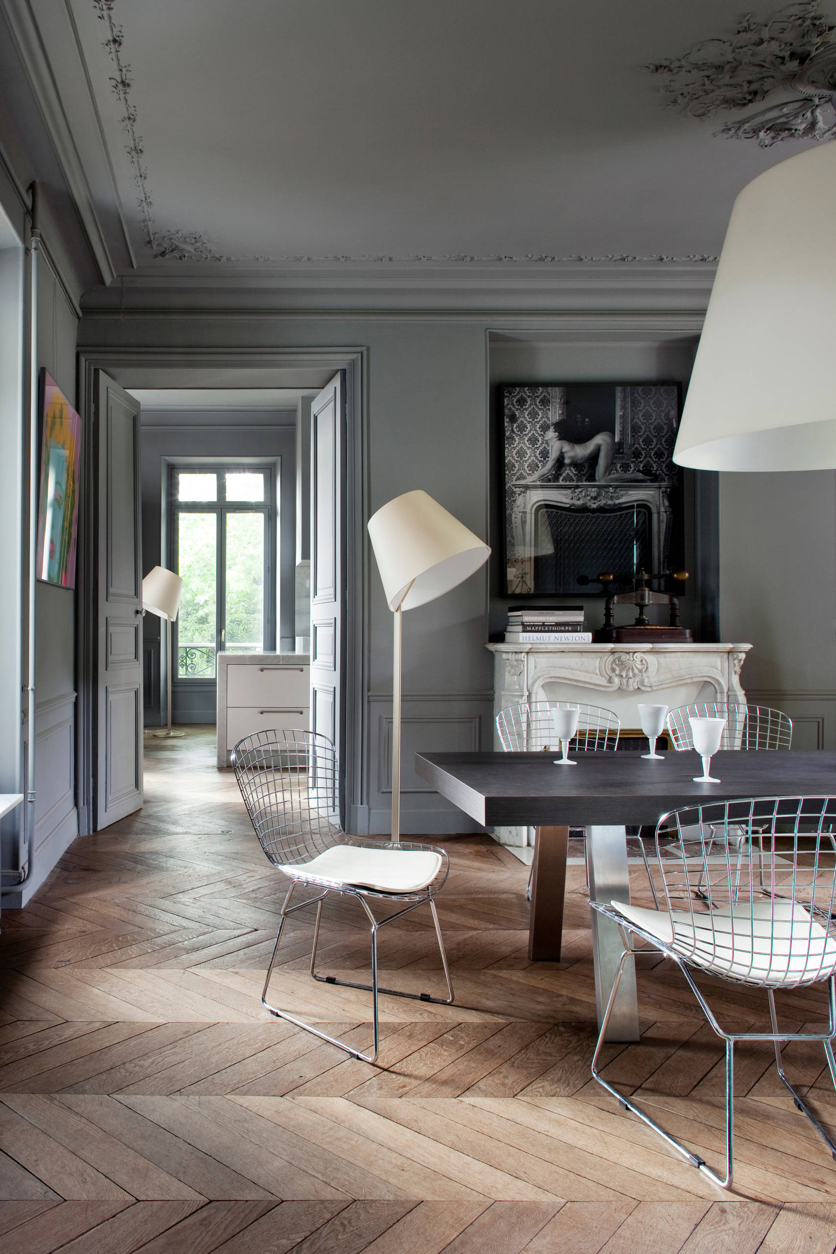 Pour casser les codes avec style dans une pièce ultra-classique, optez pour un mobilier design décalé et n’hésitez pas à offrir à votre cheminée un encadrement étonnant et artistique à la place de son miroir d’origine. Vous n’êtes pas obligé d’aller aussi loin que dans cette maison bourgeoise coquinement revisitée.