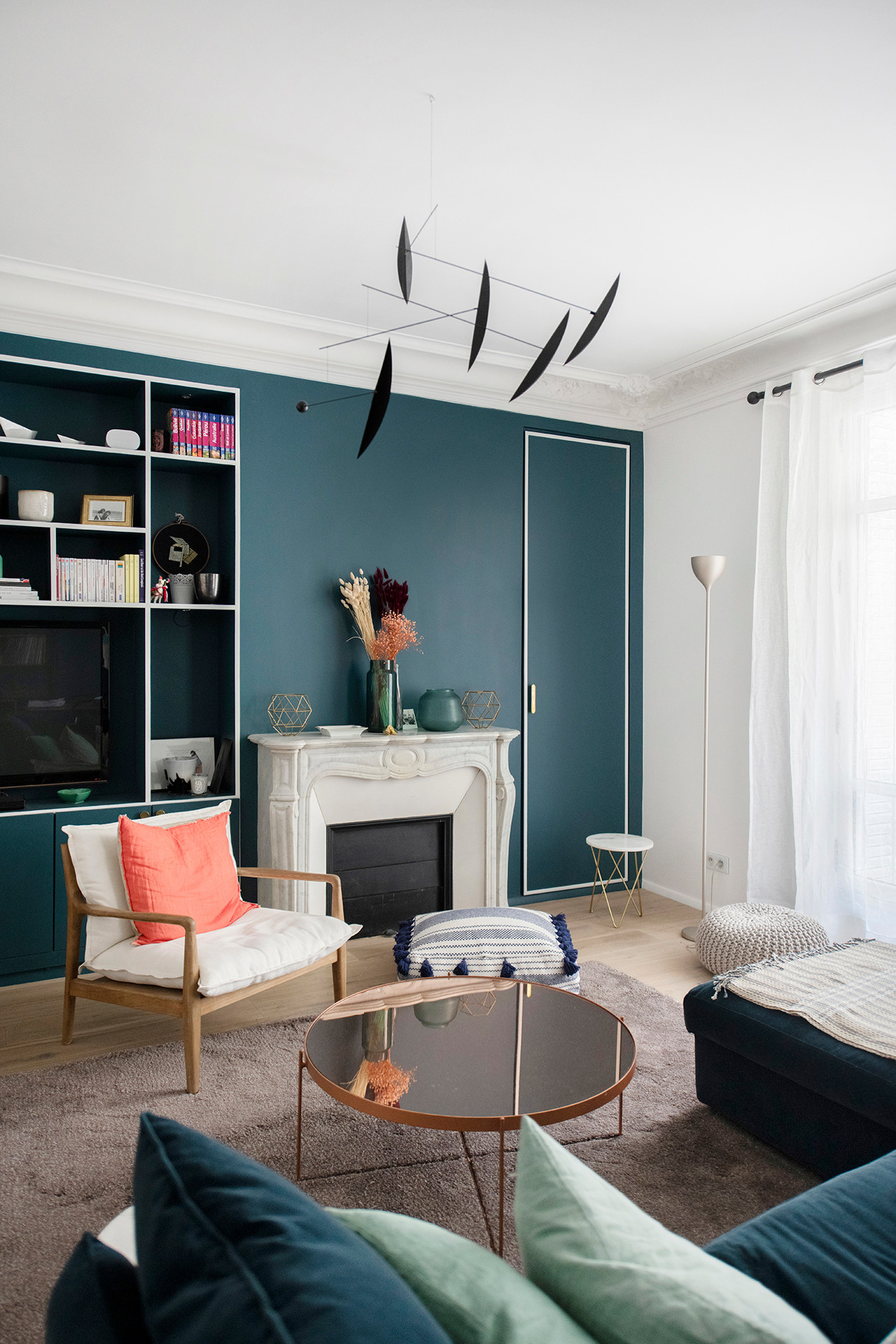Le parti pris inverse est celui du pan de mur noir. Intégrer la cheminée dans un pan complètement noir ne la fera pas ressortir. C’est le mur entier qui sera mis en avant, par contraste avec les autres. En témoigne cette pièce haussmannienne à Bordeaux.