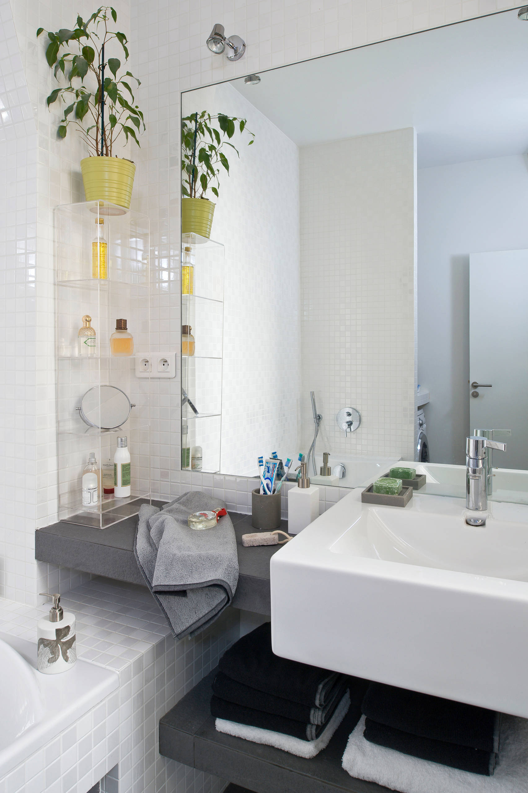Ces étagères de salle de bains en acrylique employées par Manuel Sequeira dans un appartement parisien ont un impact visuel très limité. Elles accueilleront néanmoins une foule d’accessoires utiles pour rendre la toilette agréable. Choisissez-les déco et colorés puisqu’ils apparaîtront en première ligne.