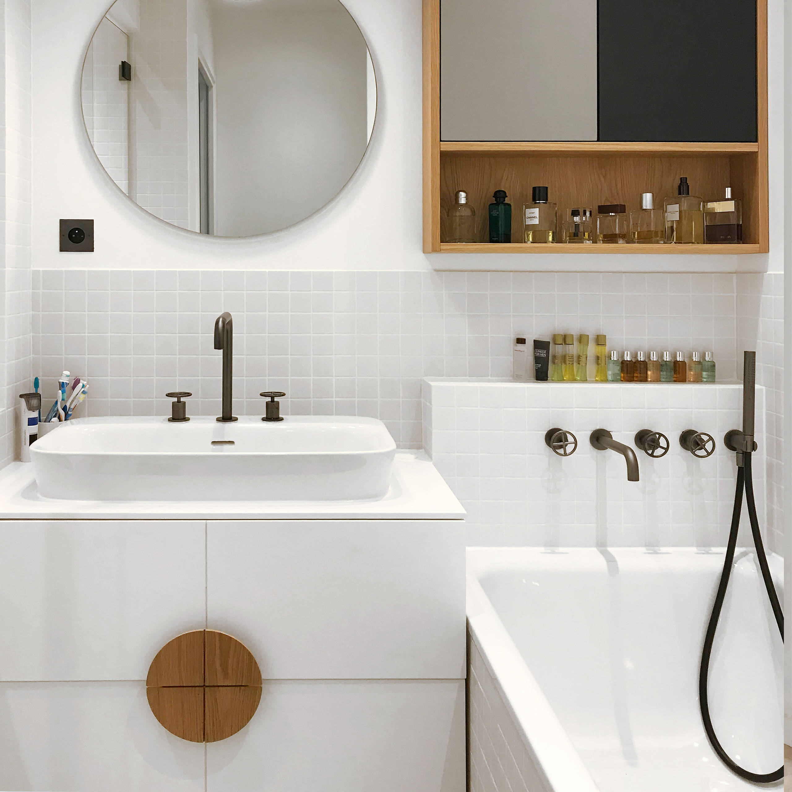 L’espace en bout de baignoire est souvent perdu. C’est donc l’une des zones à traiter en priorité pour gagner des rangements. Il n’est pas nécessaire de prévoir des placards très profonds : des étagères étroites peuvent accueillir de nombreux accessoires nécessaires à la toilette.