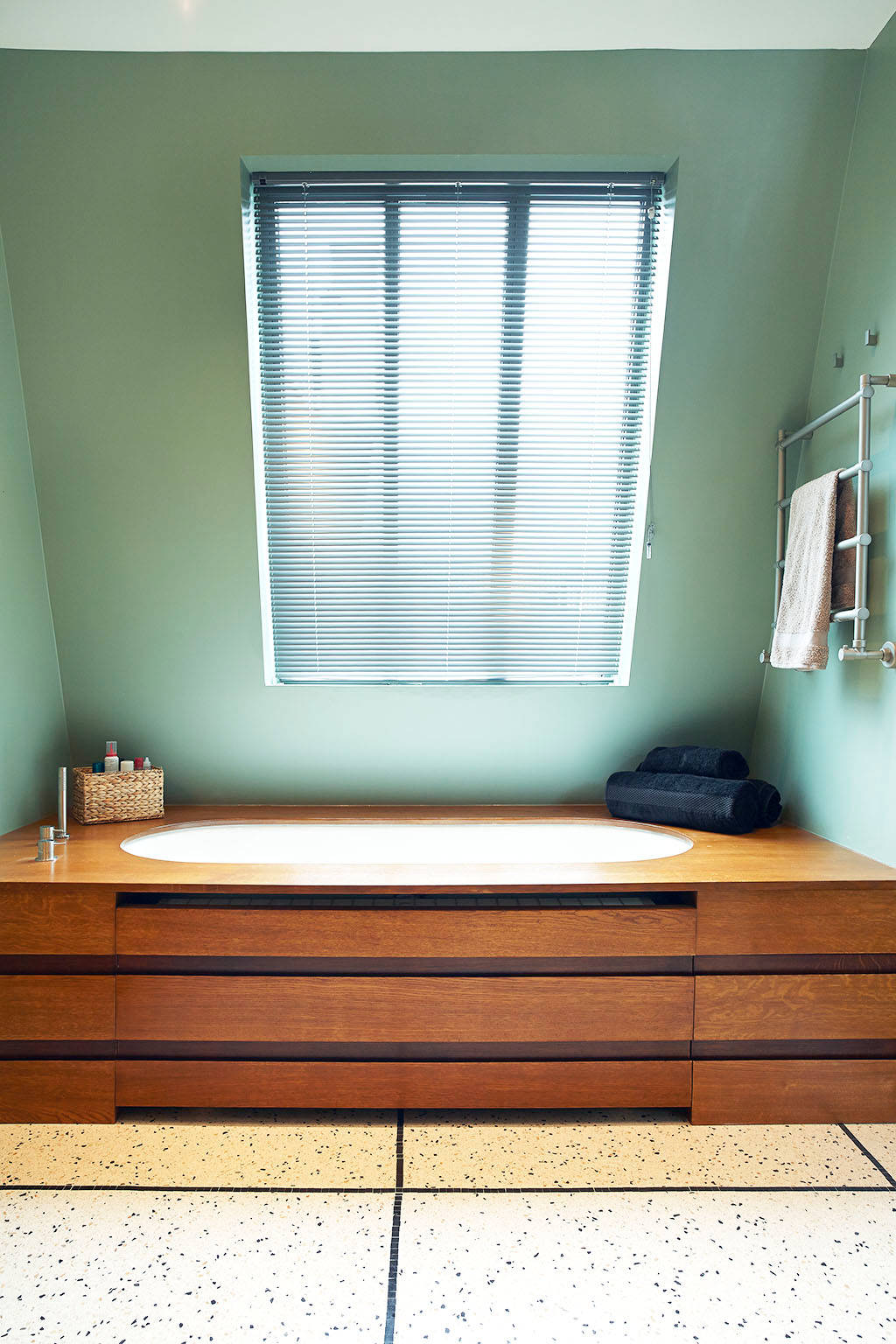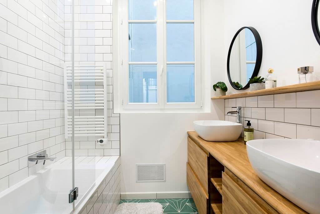 Si votre petite salle d’eau est placée dans les combles, optez pour une petite baignoire plutôt qu’une douche car elle se placera sous les rampants et vous fera gagner de la place au sol. Pour optimiser l’espace au maximum dans cette salle de bains parisienne, le tablier de la baignoire joue aussi le rôle de coffre et un sèche-serviettes a été placé à un endroit perdu.