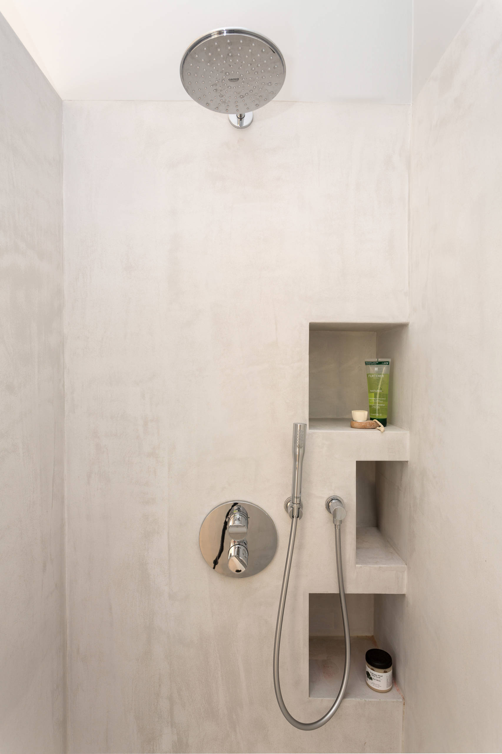 Aujourd’hui, les douches sont vastes. Équipez la vôtre de tablettes (ou prévoyez des niches) pour y poser tous vos produits et accessoires de toilette. Ainsi, ils n’encombreront plus vos placards ni le sol de la douche.