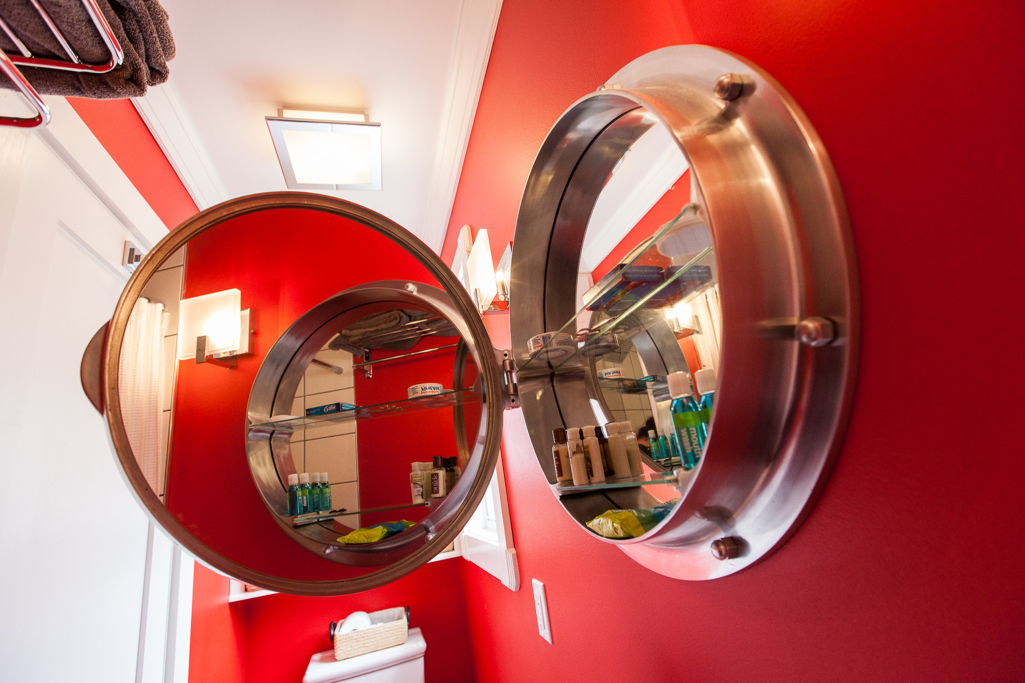 Cette armoire à pharmacie offre aussi un miroir bien utile au-dessus du lavabo. Elle n’est pas non plus dépourvue de potentiel déco puisque sa forme de hublot permet de donner à cette salle de bains minuscule un air de cabine de bateau. Une métaphore filée au moyen d’un porte-serviettes en hauteur, comme dans les couchettes de train.