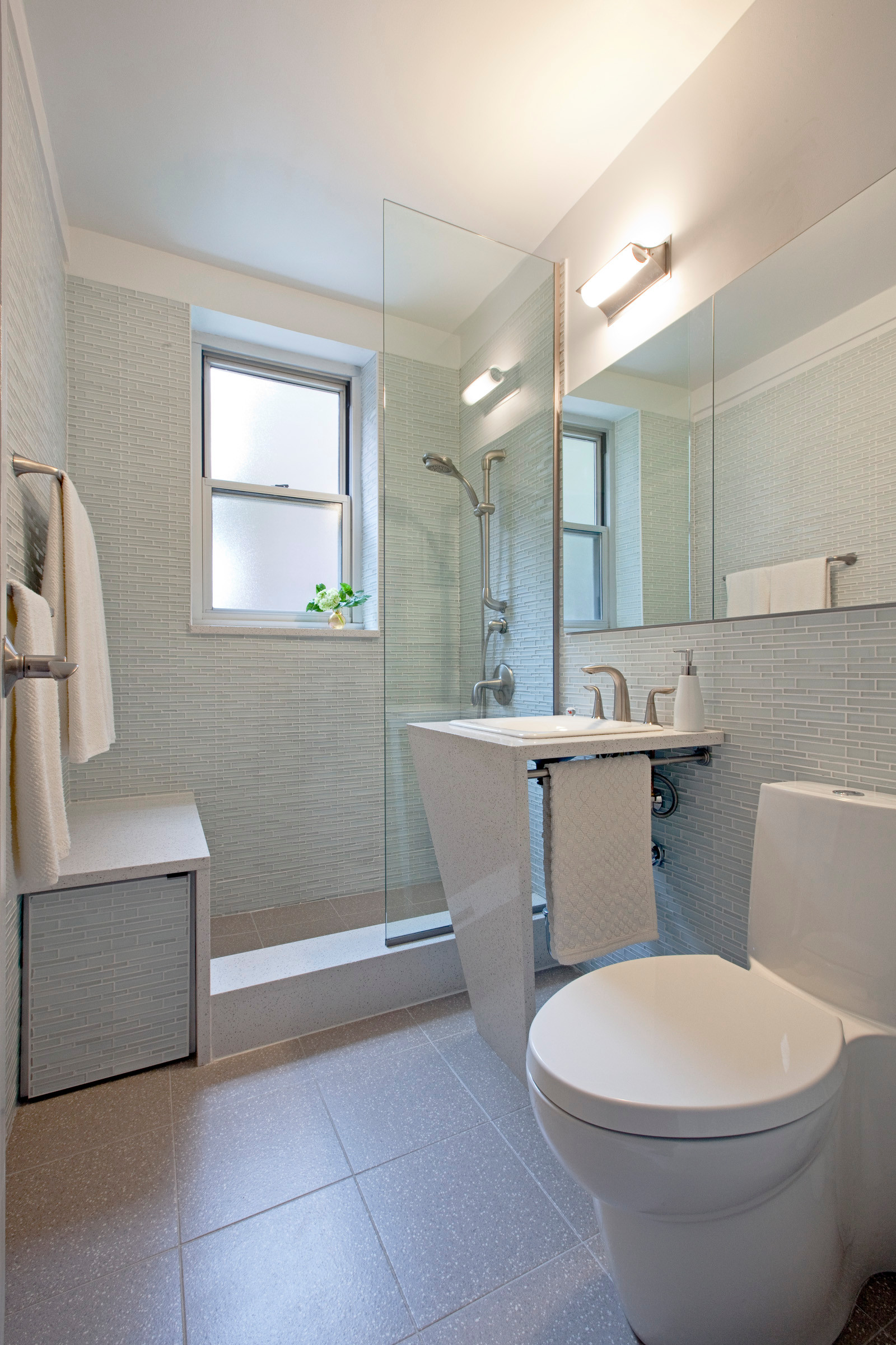 Le fond de la douche peut aussi représenter une place perdue. Ici, plutôt que de l’avoir traité en colonne de rangement, un coffre a été aménagé pour permettre, également, de s’asseoir. Un aménagement malin, pas tant pour la quantité de rangement que pour le grand confort d’usage qu’il apporte dans une petite salle de bains ; à retenir pour les personnes âgées ou à mobilité réduite !