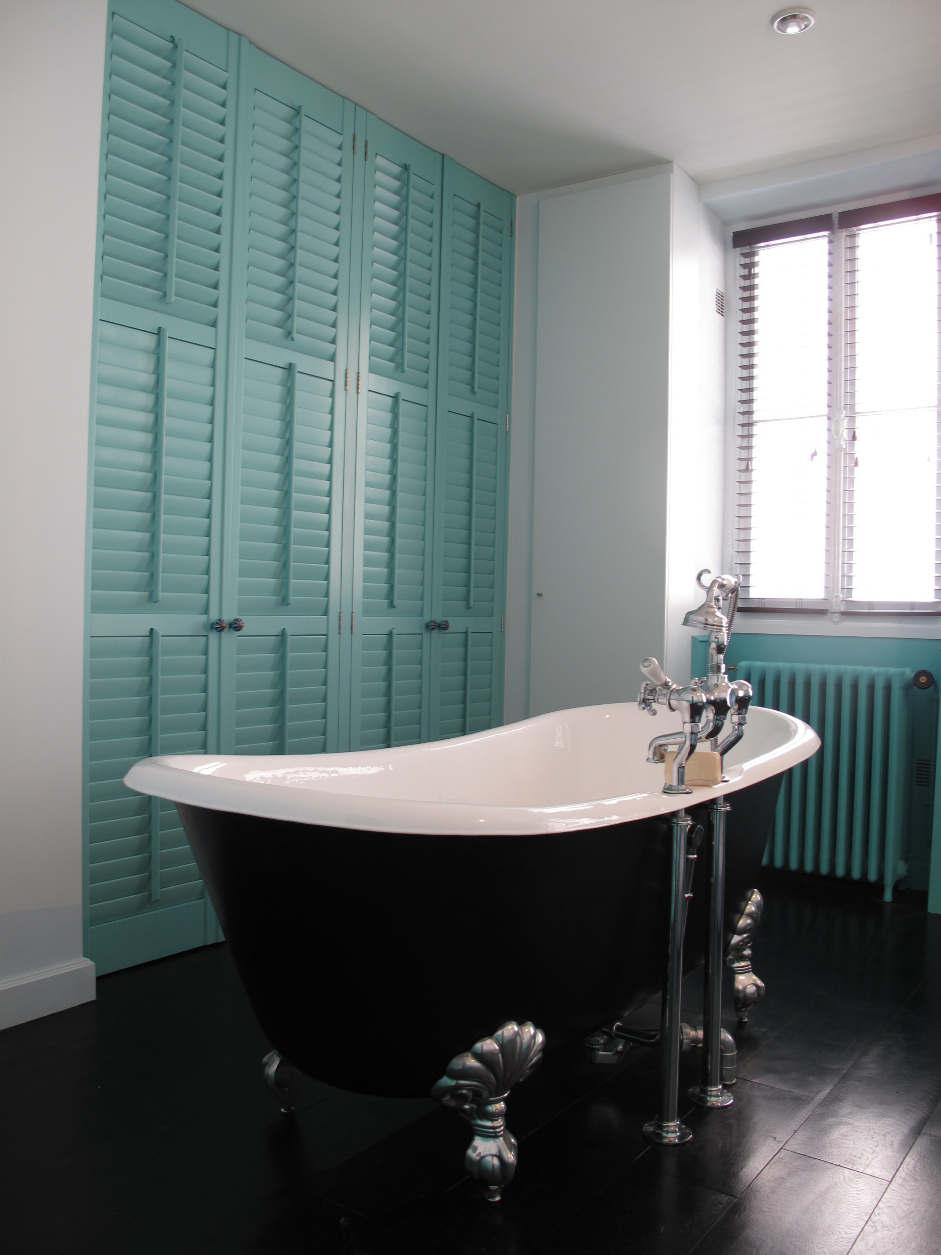 Plus l’espace est épuré et plus il paraît vaste. Dans cette salle de bains à Levallois, le grand placard a été dissimulé au moyen de portes persiennes. La professionnel en charge du projet en a même fait un atout déco en les peignant d’un joli bleu repris par le radiateur.