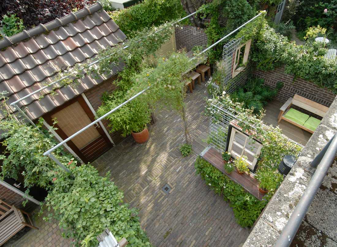 À Amsterdam, cet extérieur est devenu comme une seconde maison verdoyante. Les espaces sont séparés par des paniers de gabion métalliques. Soit ils sont remplis, mais de bois pour changer et occulter (ou permettre de stocker son bois). Soit ils sont vides, pour délimiter les espaces de manière ajourée, et permettre à la végétation d’y grimper ! On retient aussi l’idée d’y insérer des fenêtres de récup pour le côté fun.
