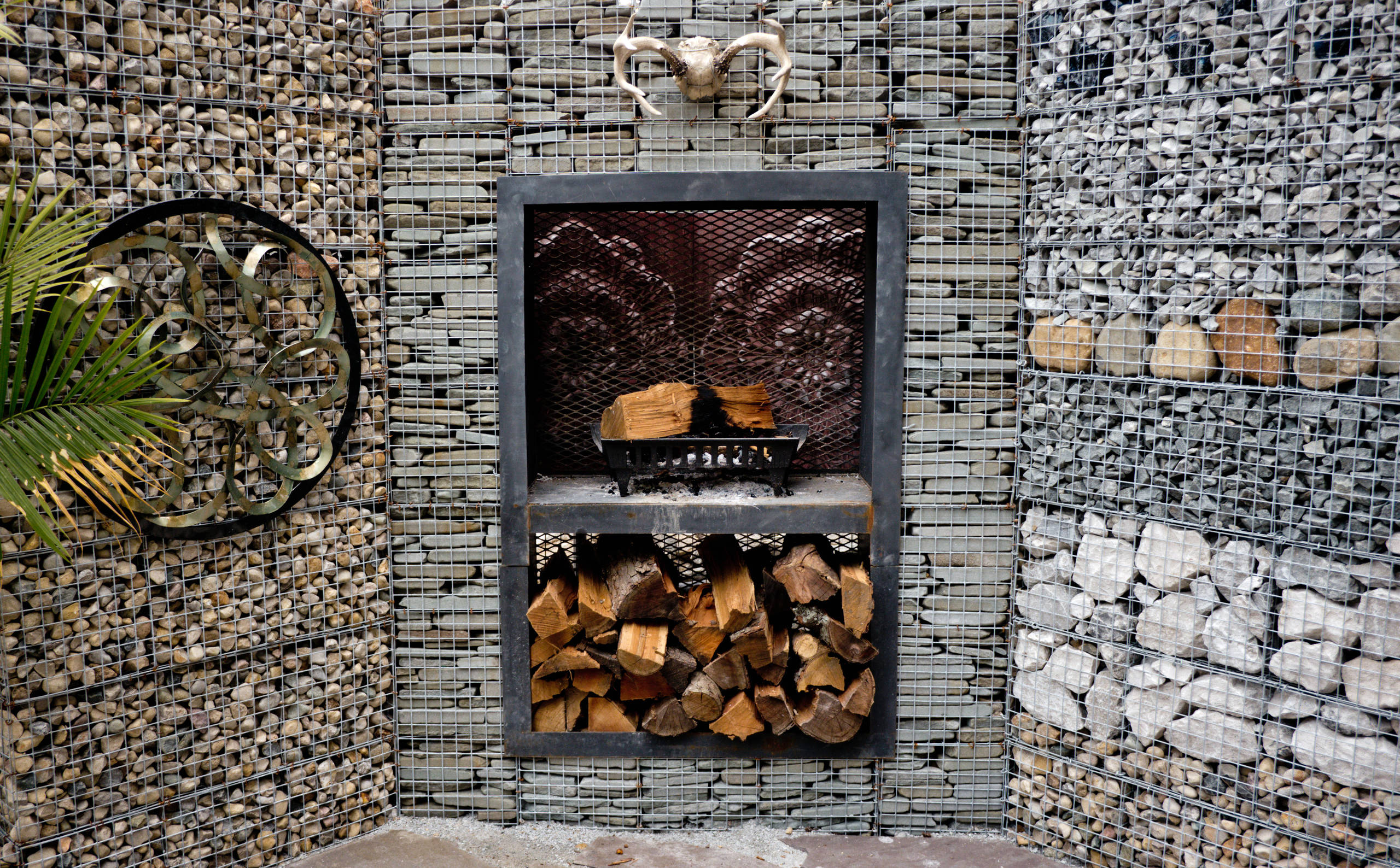 Avec ces grandes cages métalliques, il ne s’agit pas de faire uniquement des murs de séparation avec le même style de pierres. On peut les garnir de pierres différentes, mais aussi de bois, de végétation, pour un aspect plus stylisé. Mais aussi s’en servir en support de foyer comme ici, de bancs, de bordures, etc.