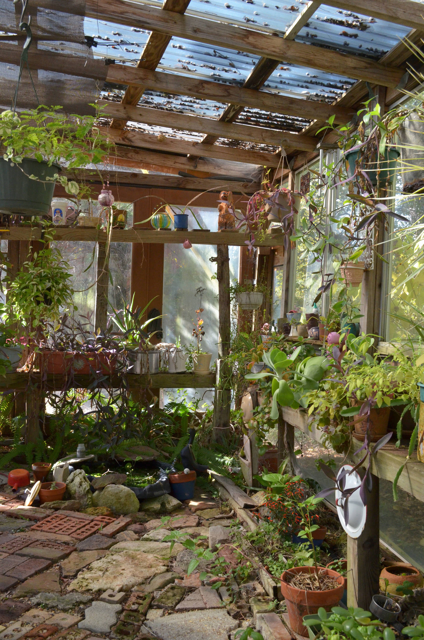 Quelques parois vitrées ou de polycarbonate, légères et faciles à trouver, composent cette serre de jardin. Des pierres mais aussi des briques et des carreaux de ciment s’unissent pour un sol mêlant nature et récup’.
