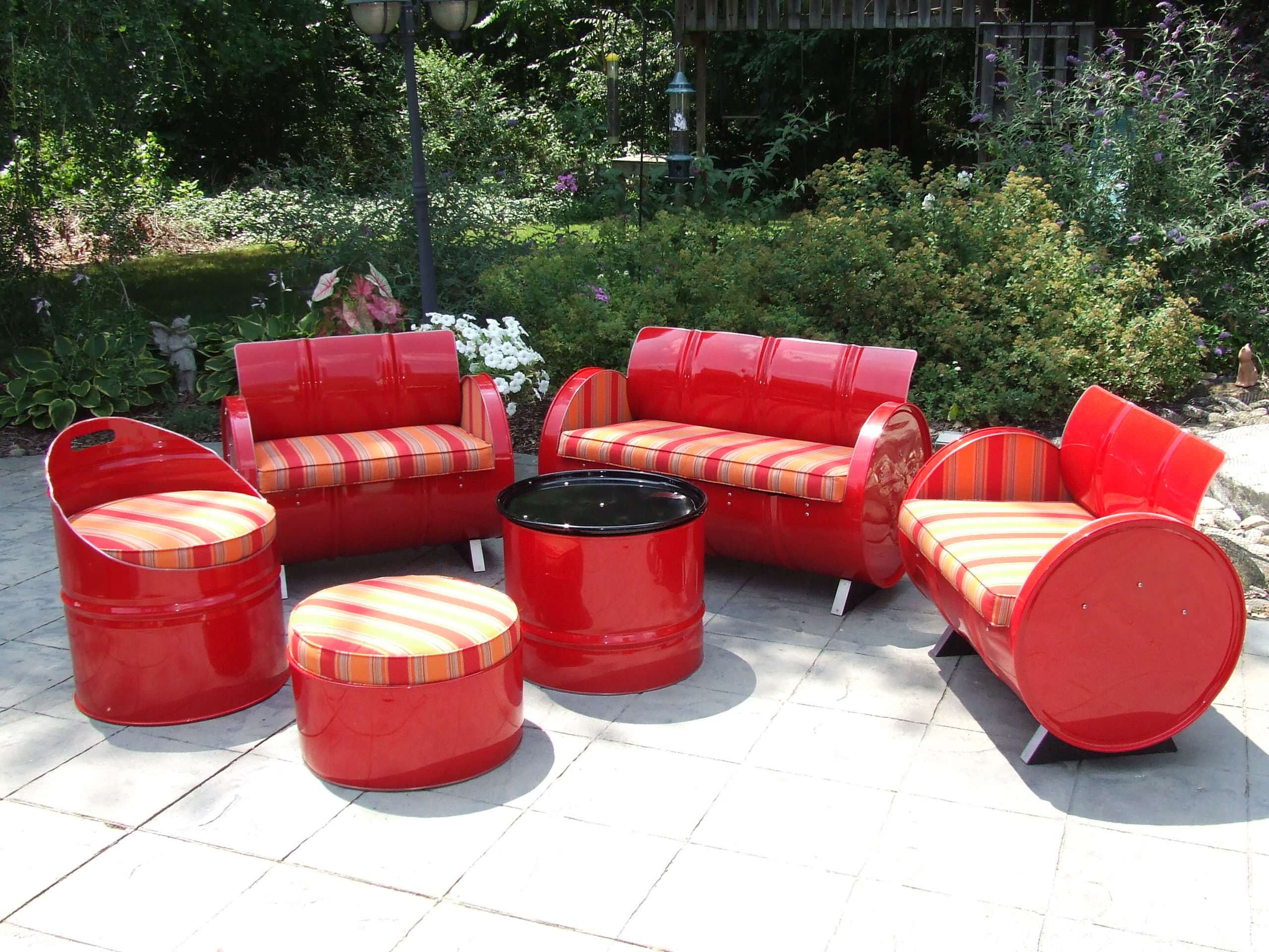 Mais oui, c’est à partir de bidons d’huile de garage qu’a été composé ce salon de jardin. Une peinture brillante et des assises vintage donne une toute autre allure à ces bidons découpés et assemblés.