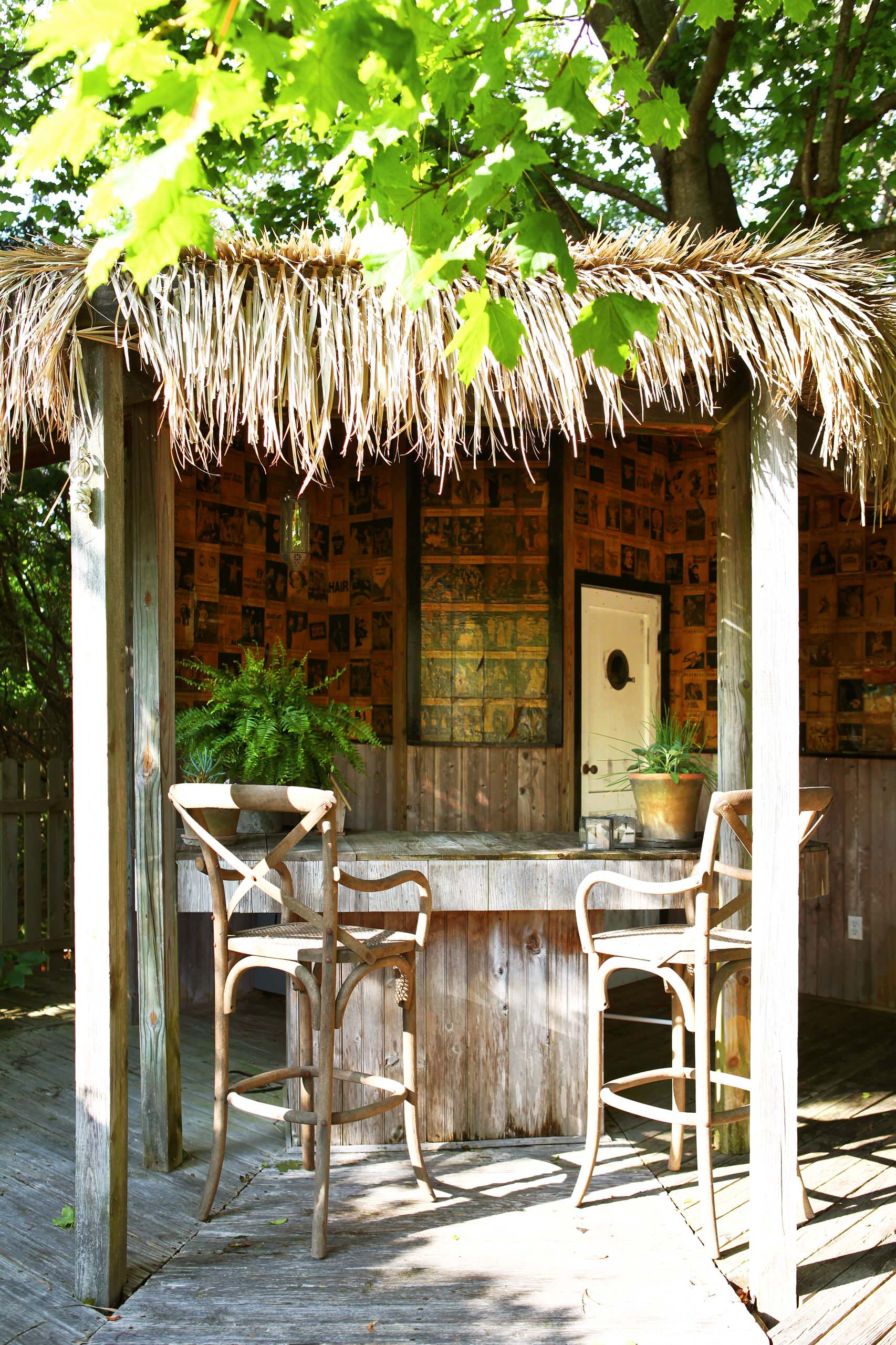 Plots et planches de bois, feuilles de palmier, chaises de bar de récup’ composent ce bar de plage ou tiki bar en bengalien. N’oubliez pas de le décorer en style néo-kitsch : des affiches anciennes, des plaques émaillées, des autocollants, des étiquettes de bouteilles.