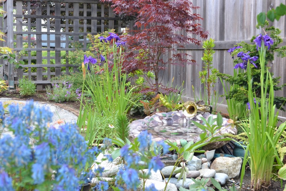 Idée toute simple mais effet joyeux pour ce point d’eau agrémenté d’une trompette ! Quelle douce musique en émane à présent… Elle aura cependant besoin d’une pompe, comme toute vraie fontaine.