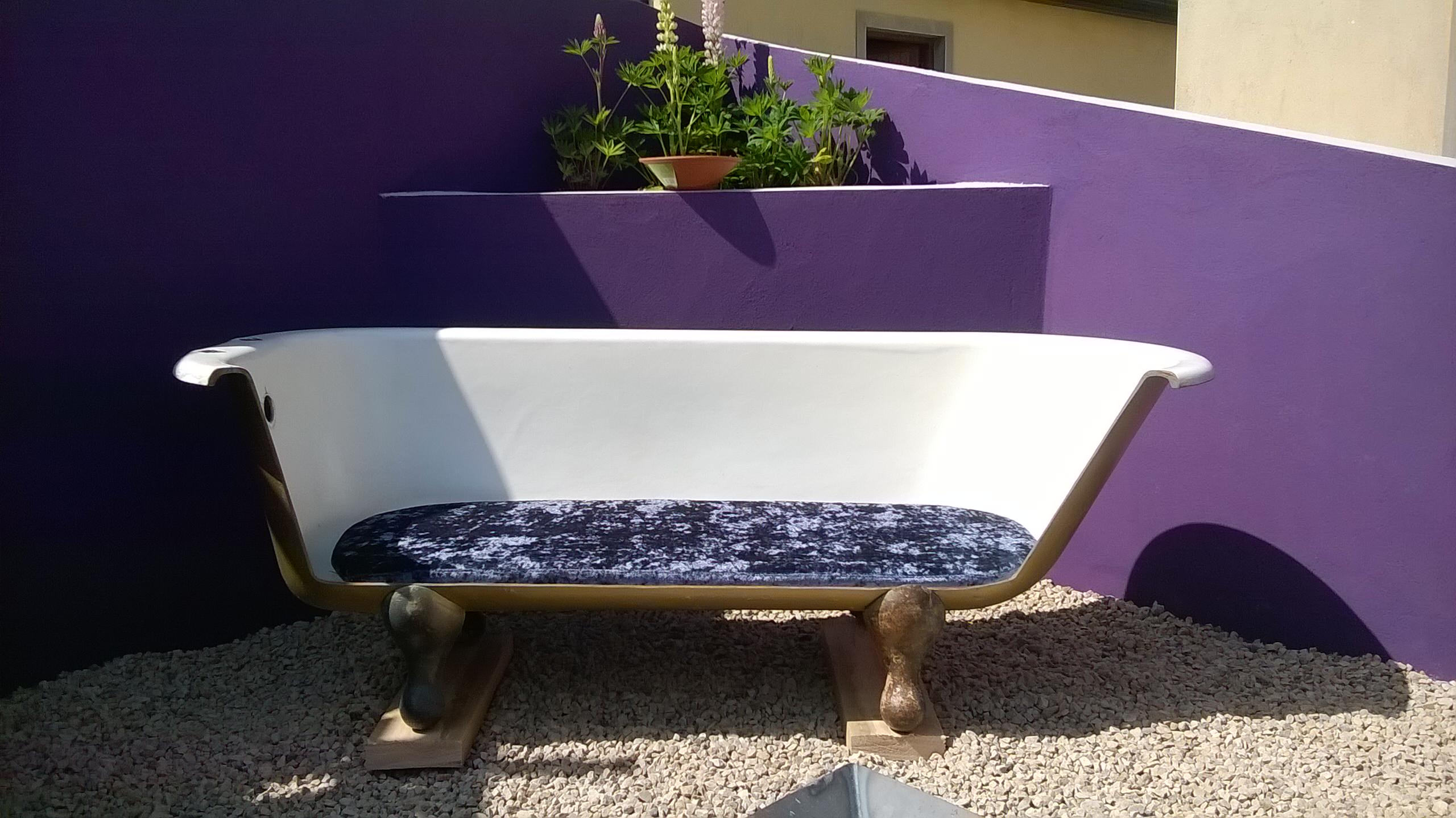 L’upcycling, ou détournement d’objets, trouve aussi sa place en extérieur. Ainsi, cette ancienne baignoire sur pieds découpée devient une charmante banquette.