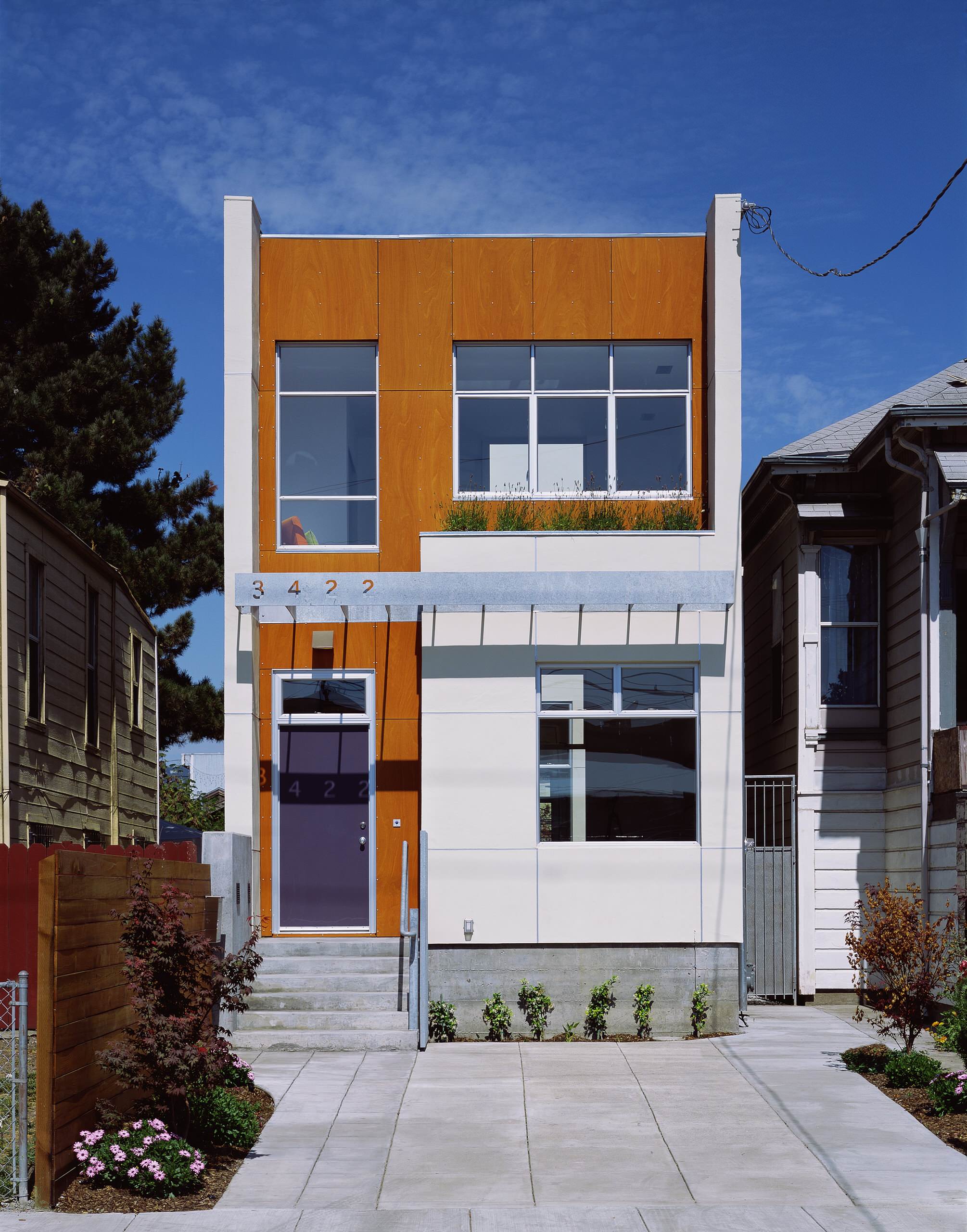 Cette habitation étroite mais assez haute nécessite de lever les yeux pour pouvoir en savourer pleinement l’architecture. Pourquoi donc ne pas utiliser le numéro pour renforcer cette idée de hauteur ?