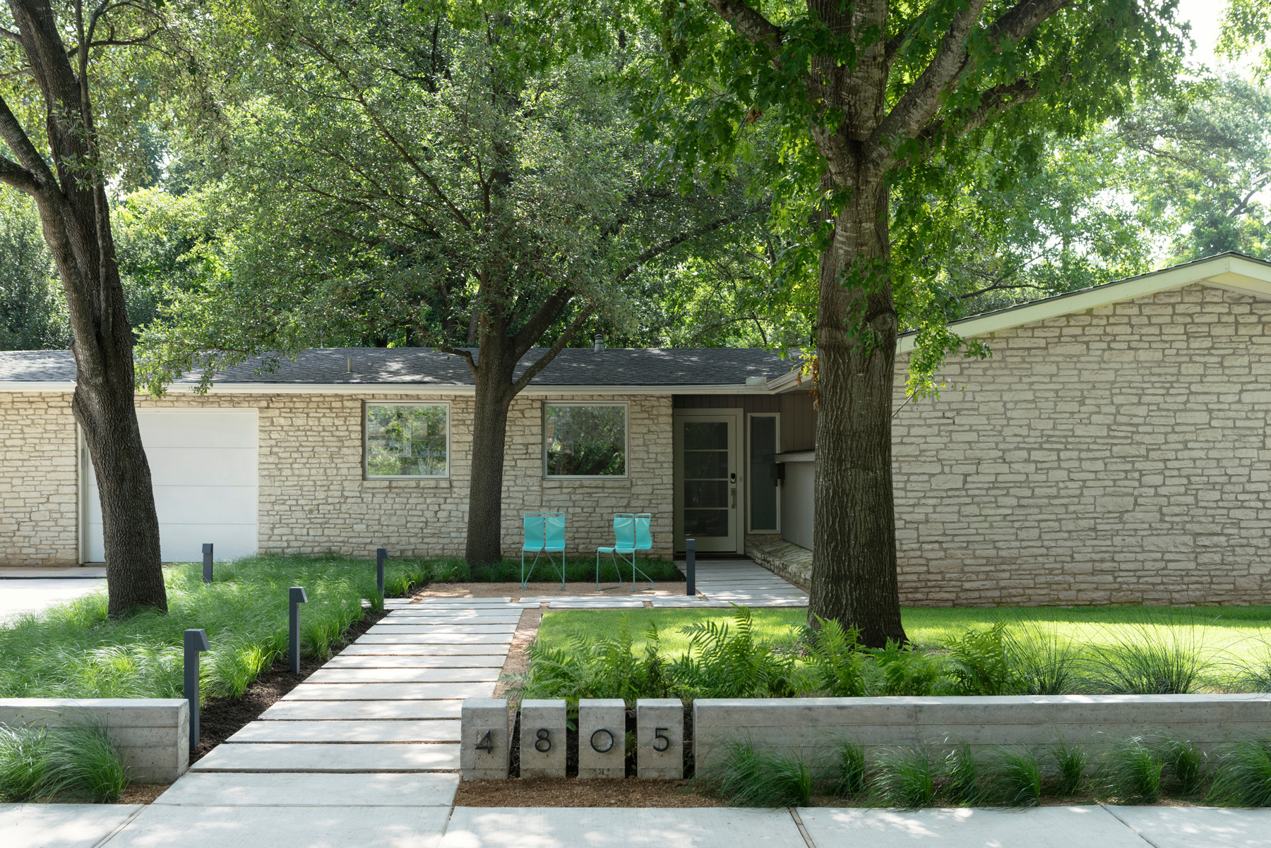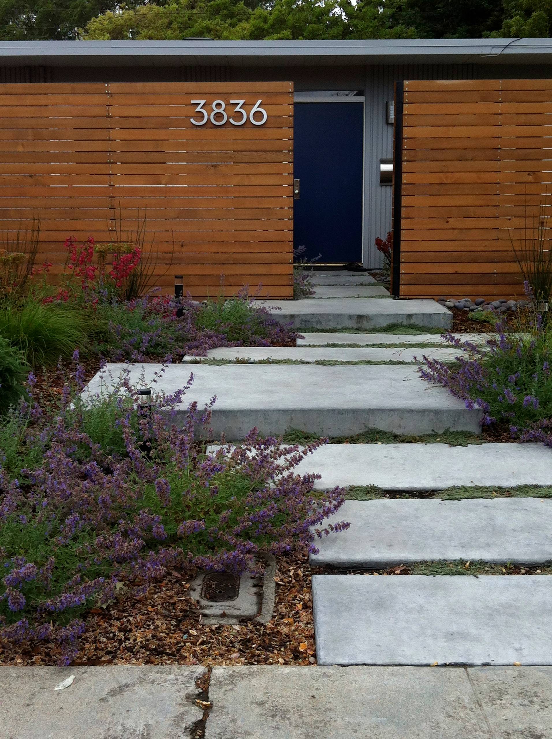 Inversement, si la maison est plutôt basse, il sera plus intéressant de créer un point de focus à ras du sol. En positionnant comme ici le numéro de la maison sur un mini-muret, on va de manière naturelle changer la perception des éléments environnants. Cette maison de plain-pied ne paraîtra nullement disproportionnée.