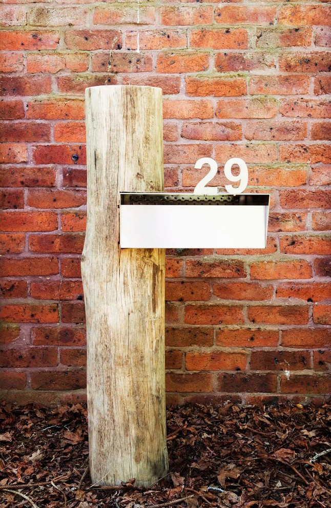 Plutôt que d’associer le numéro à la porte, on peut choisir de le mettre en relation avec la boîte aux lettres. Ça change un peu et permet aussi de montrer sa créativité. La simplicité est ici aussi gage d’efficacité ! Les numéros et la boîte dépouillés se remarquent et se démarquent du mur en brique.