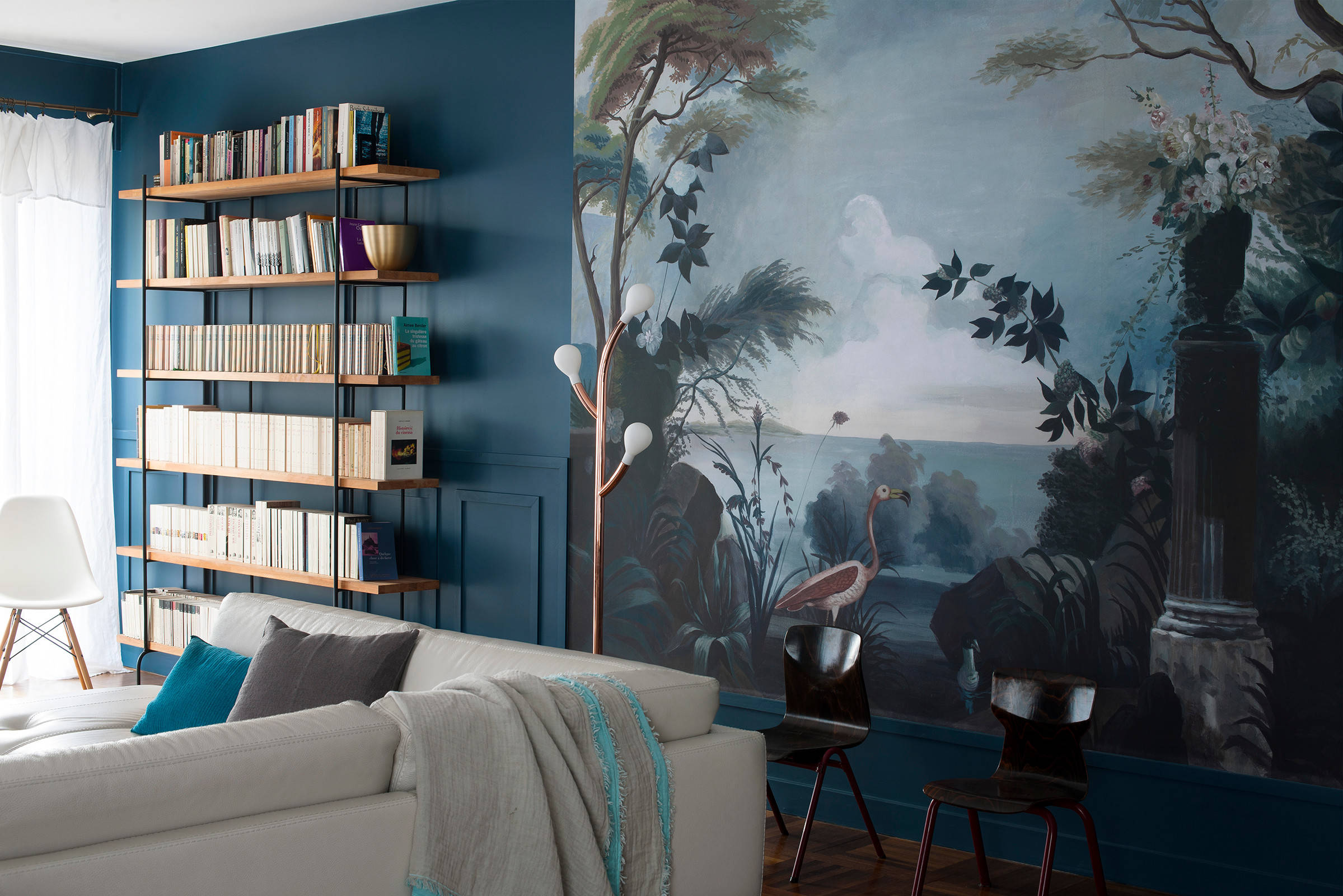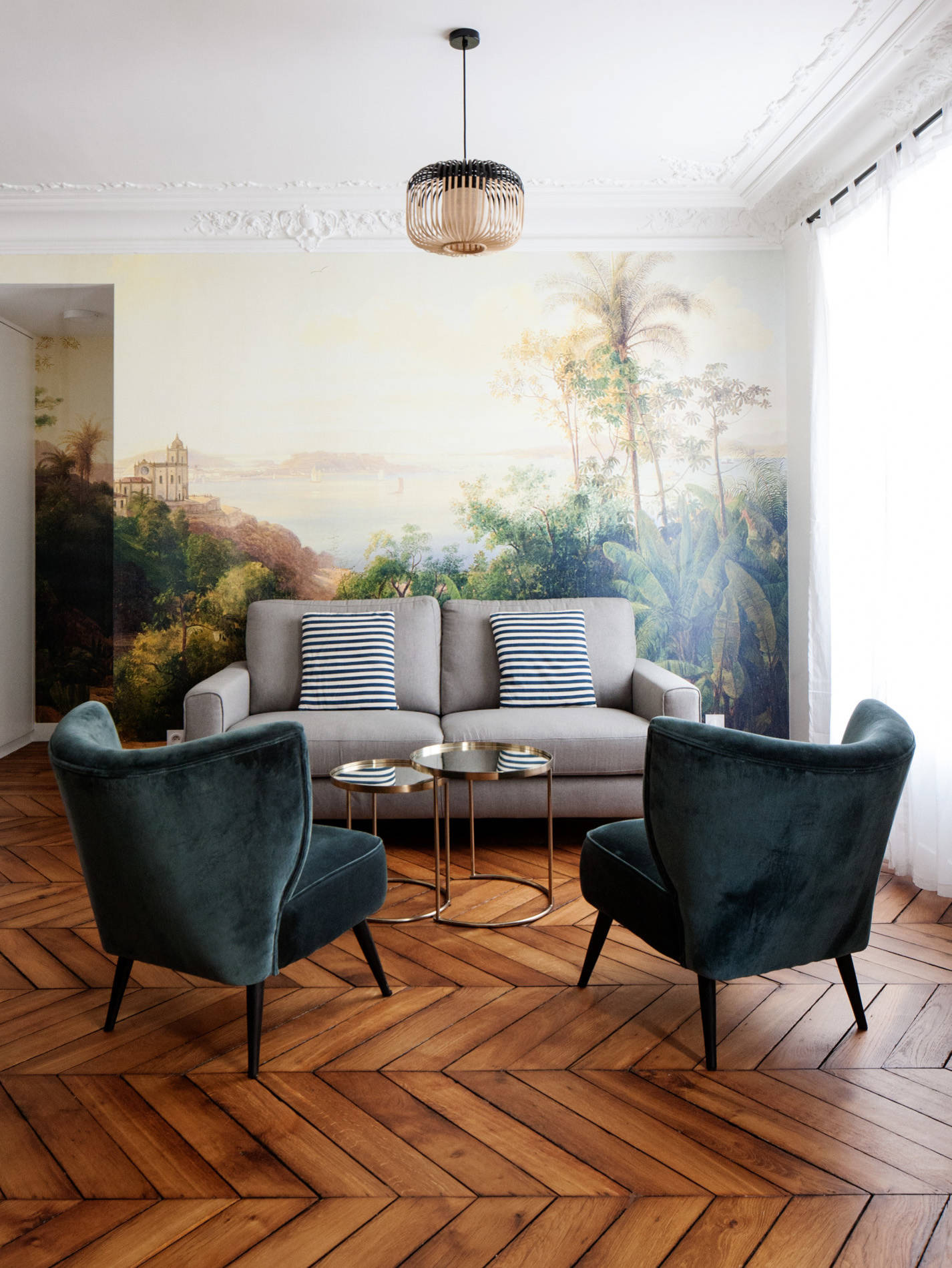 Ici, toujours à Paris, il est posé tel un tableau grand format pour habiller une partie seulement du mur du salon. Le reste de la paroi reprend simplement les teintes du paysage pour créer une unité dans la décoration de la pièce.
