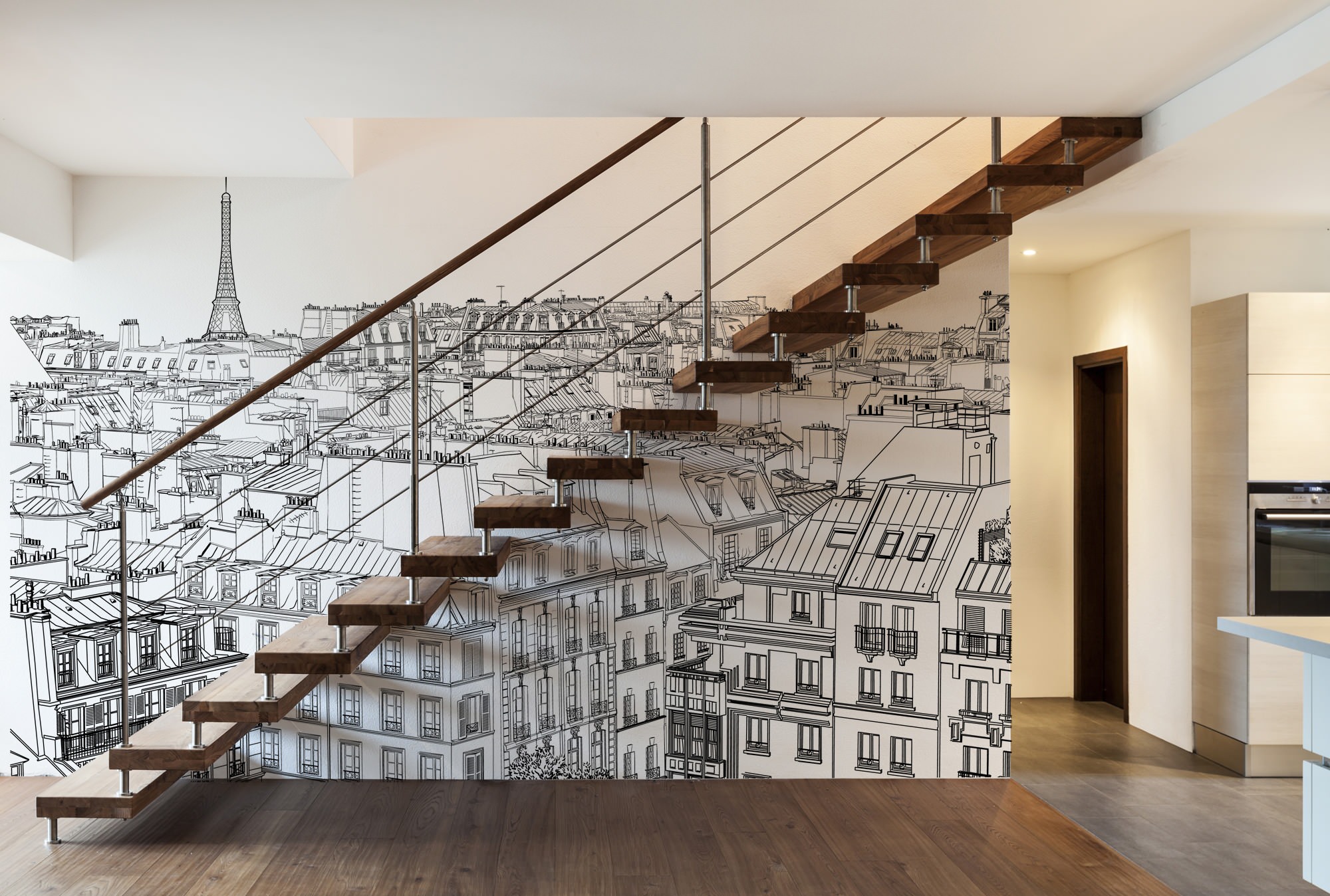 Vous ne savez pas quoi faire de ce mur sur lequel s’appuie votre escalier ? Donnez-lui de la personnalité avec un papier peint au motif grand format. Ici, le papier peint panoramique toits de Paris ne rompt en rien le minimaliste de la décoration contemporaine avec son dessin graphique et ses teintes monochromes.