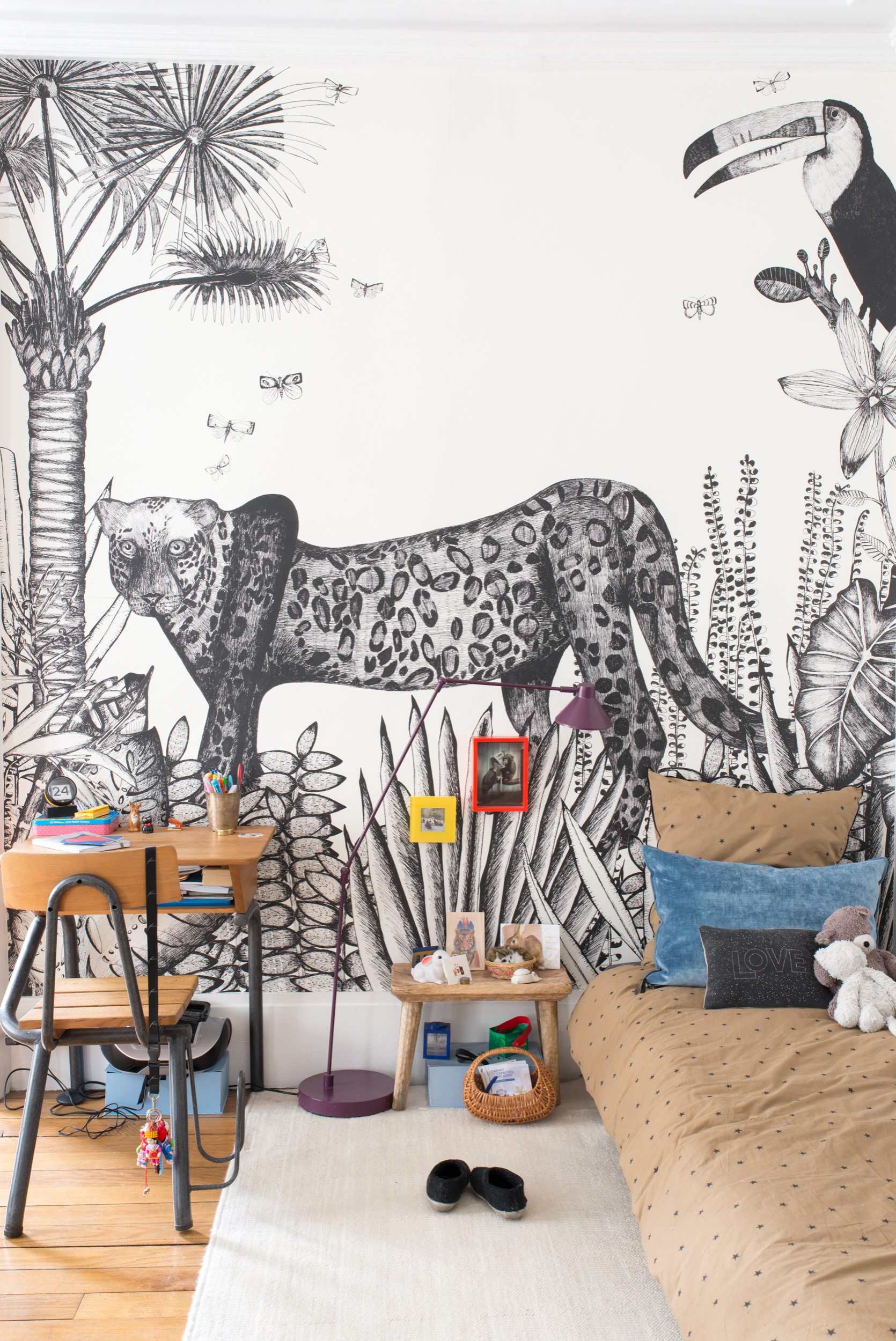 Animaux grands formats ou plantes XXL, qui ferait meilleur usage de ces décors qui font appel à notre imaginaire que nos enfants ? Les papiers peints panoramiques et leurs paysages géants ont donc tout à fait leur place dans les chambres d’enfants pour créer des atmosphères ludiques qui laissent rêveur, comme chez la blogueuse Florence ou dans la chambre bohème ci-dessus.