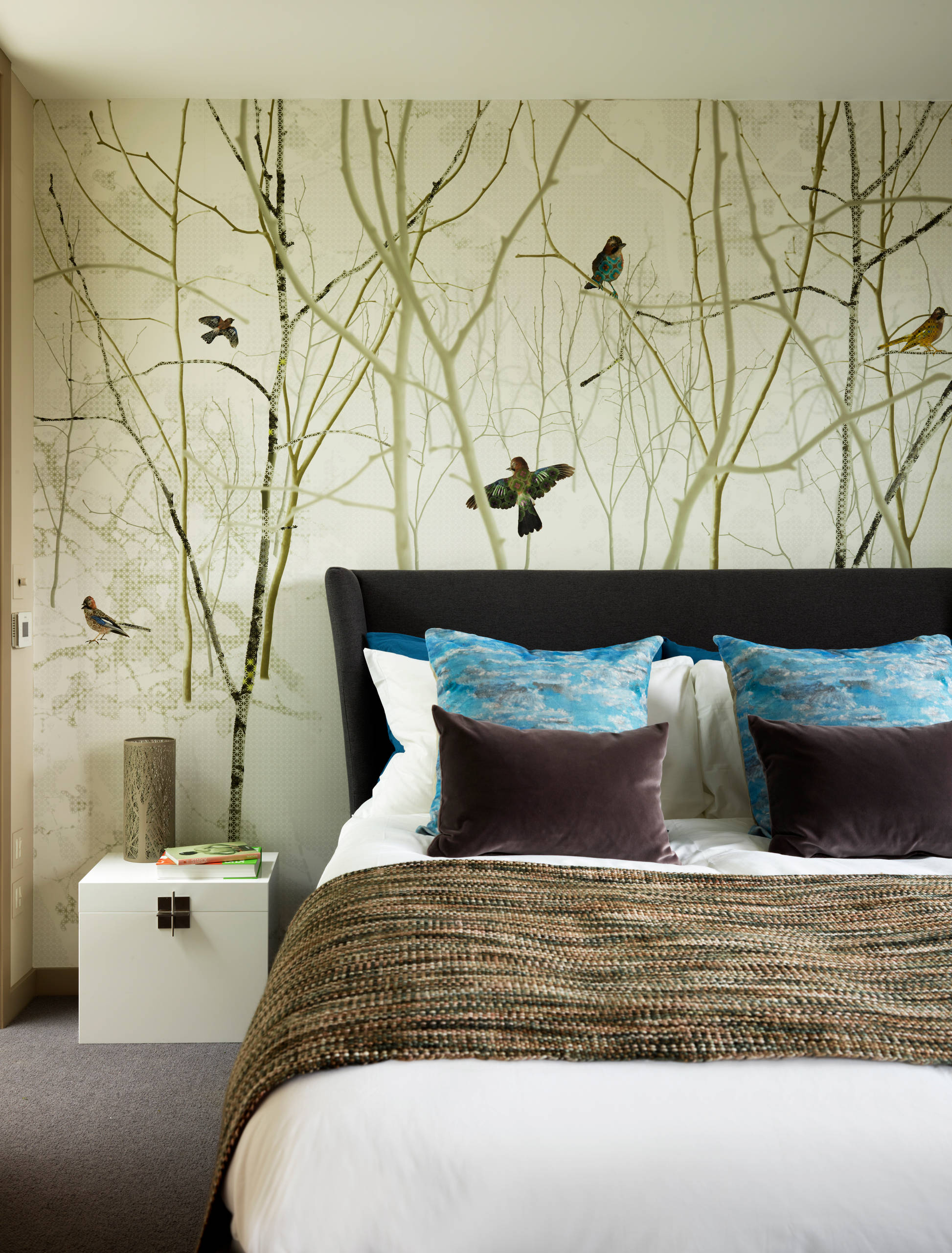Cette chambre londonienne affiche aussi une décoration chic, bien que d’un tout autre style. Les teintes de son papier peint panoramique forêt se marient parfaitement avec le linge de lit, sans oublier d’être relevées par la présence de coussins bleus.