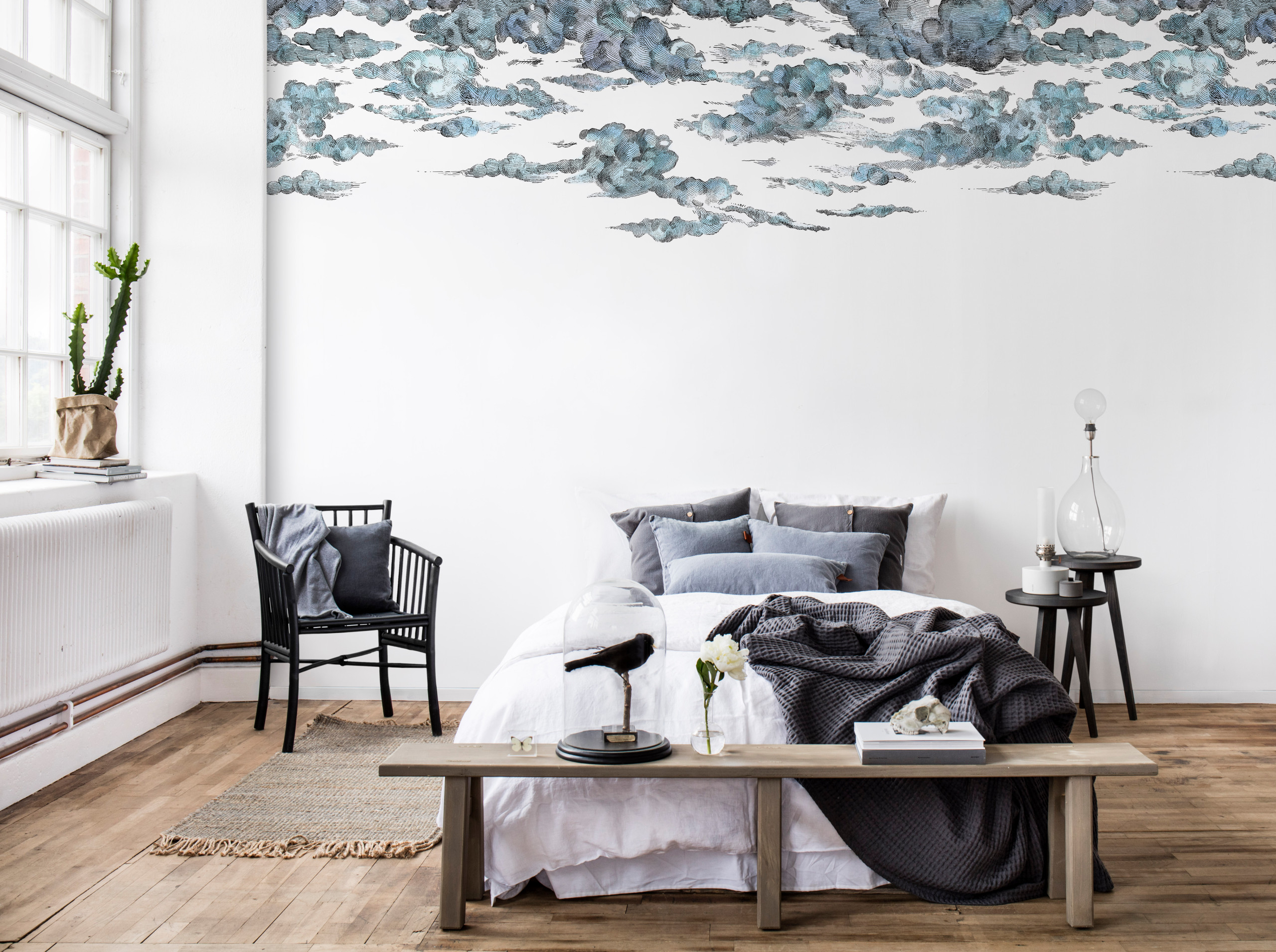 Si vous n’êtes pas prêt à franchir le pas et à vous diriger vers des motifs imposants, des versions plus soft sont possibles. Par exemple, ce papier peint panoramique n’habille que la partie supérieure du mur de nuages pour créer comme une impression de légèreté dans la chambre à coucher.
