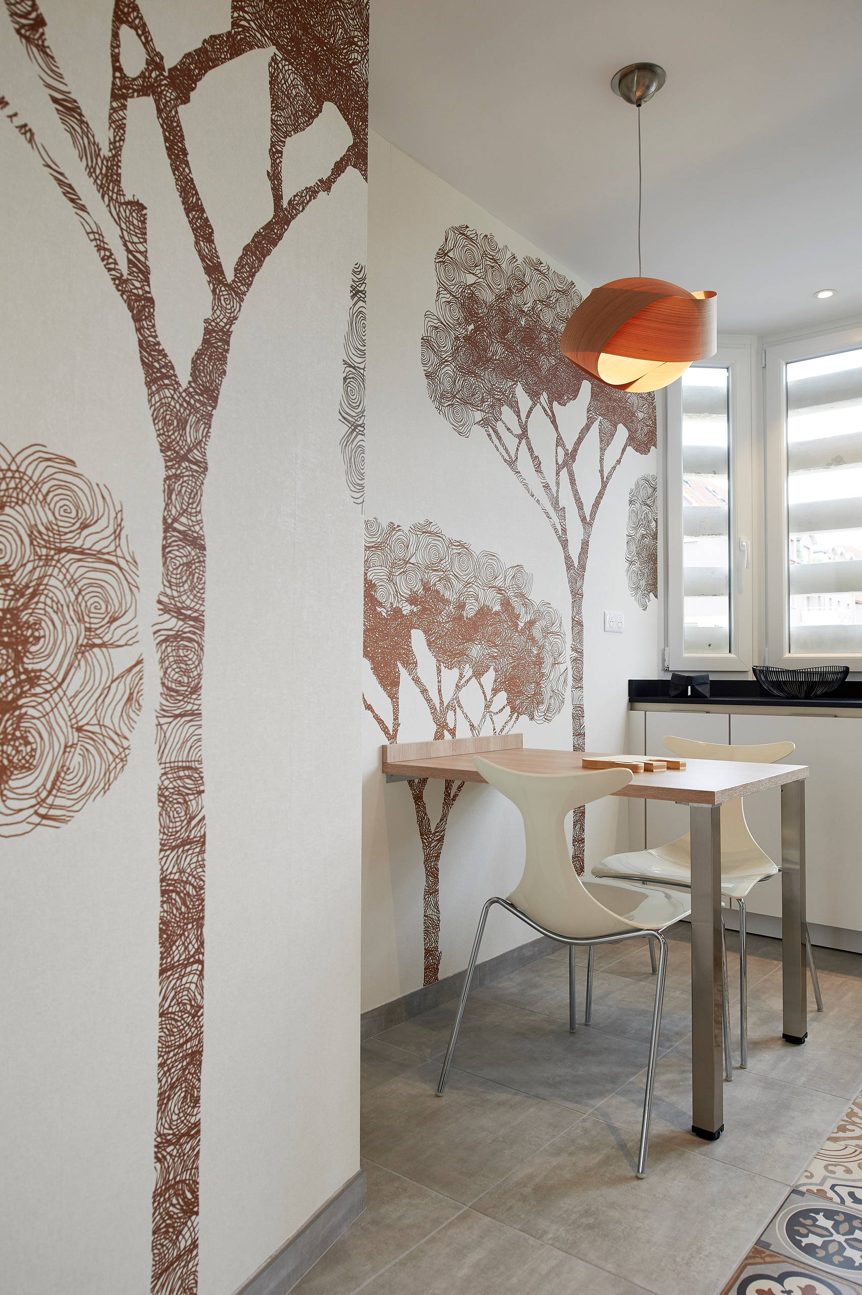 Le papier peint est idéal pour relever la décoration d’une cuisine blanche sans engendrer de travaux trop importants, et en restant dans un budget raisonnable. Ici par exemple, la cuisine s’est offerte une nouvelle jeunesse grâce à un papier peint panoramique à impression numérique, représentant des arbres exotiques.