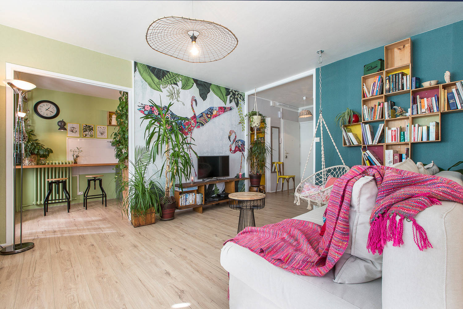 Dans un tout autre style, plus coloré mais toujours avec des flamants roses, ce modèle tissé a été conçu sur mesure. Il accompagne la décoration bohème de cet espace de vie d’Annecy avec ses motifs mêlant le végétal et l’animal.