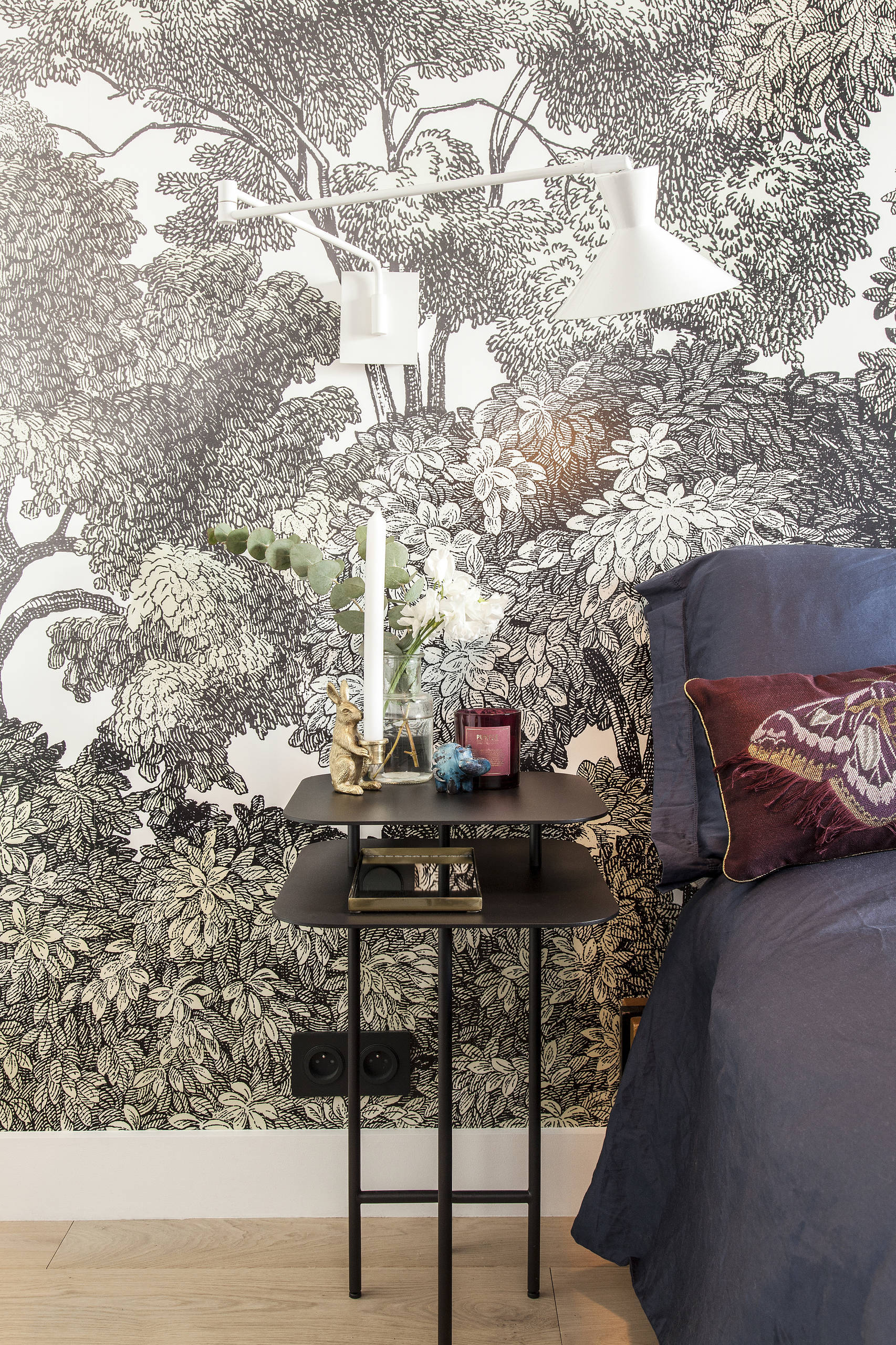 Autre astuce pour obtenir un rendu en toute légèreté : le ton sur ton ou le camaïeu. Dans cette chambre londonienne, le papier peint se fond ainsi dans la décoration malgré son motif de foret. Il est aussi plus facile à assortir qu’un modèle aux couleurs multiples, qu’il est préférable d’associer avec des teintes neutres pour ne pas surcharger.
