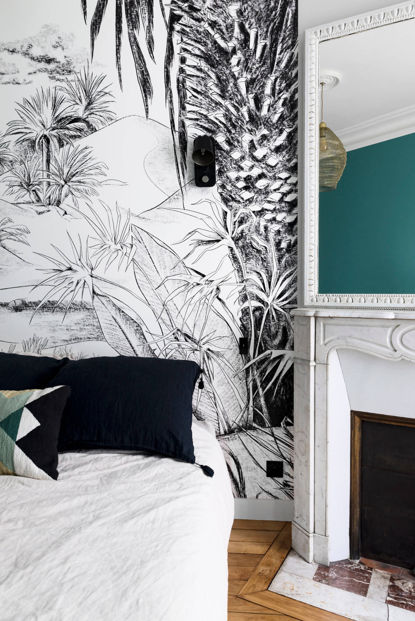 Cette chambre du XVIIIe arrondissement de Paris, a préféré un motif végétal représentant une jungle en noir et blanc. Il s’agit d’une fresque réalisée sur mesure pour s’adapter parfaitement au mur de la chambre.