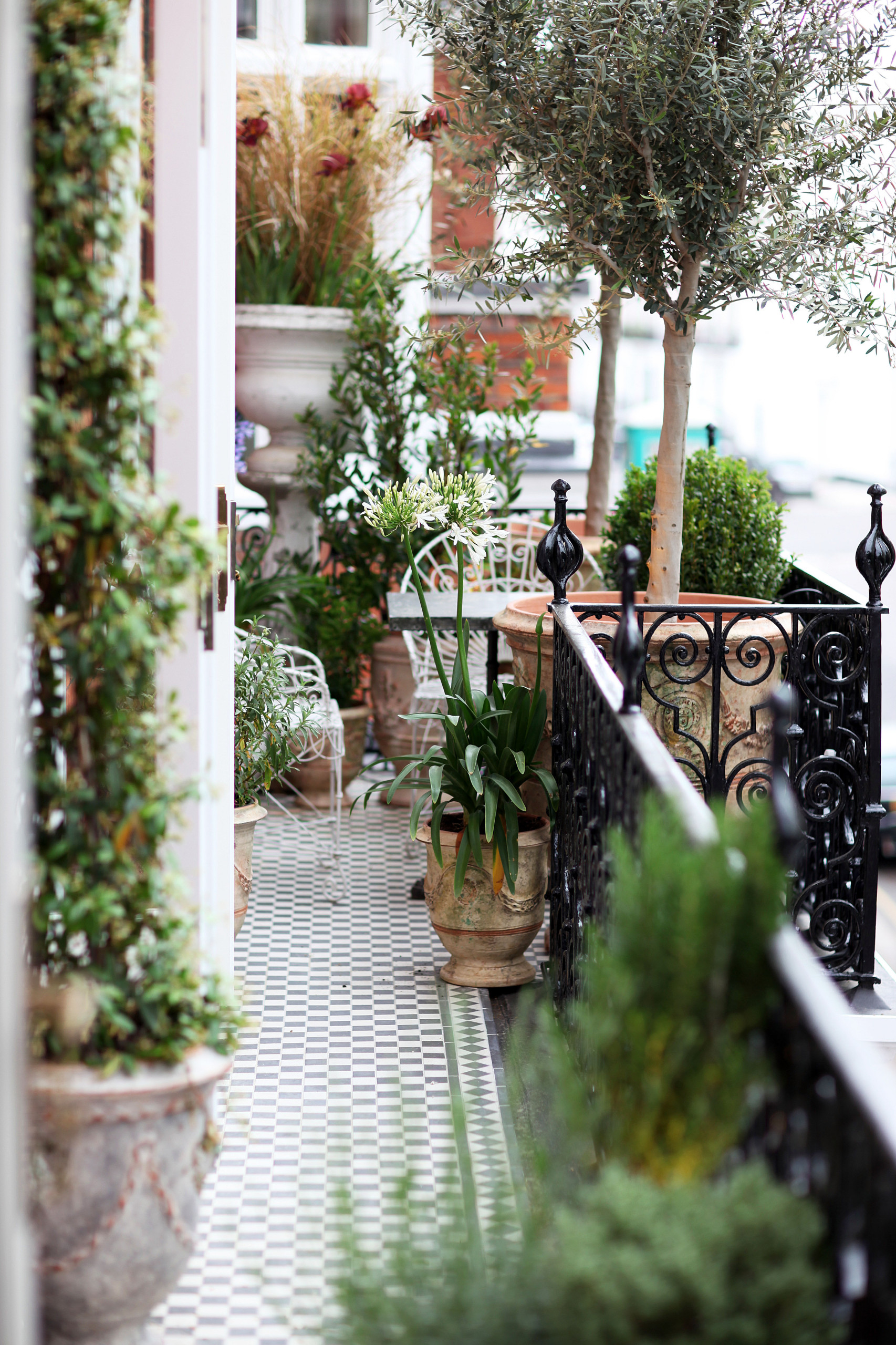 Carrelage en damier noir et blanc, garde-corps et mobilier travaillés en fer forgé reprenant les mêmes teintes, pots de fleurs en terre cuite, l’aménagement classique de ce balcon respecte l’architecture victorienne du bâtiment londonien, pour une belle mise en valeur. Le tout sublimé par la présence de nombreux végétaux, qui font oublier l’environnement urbain des lieux.