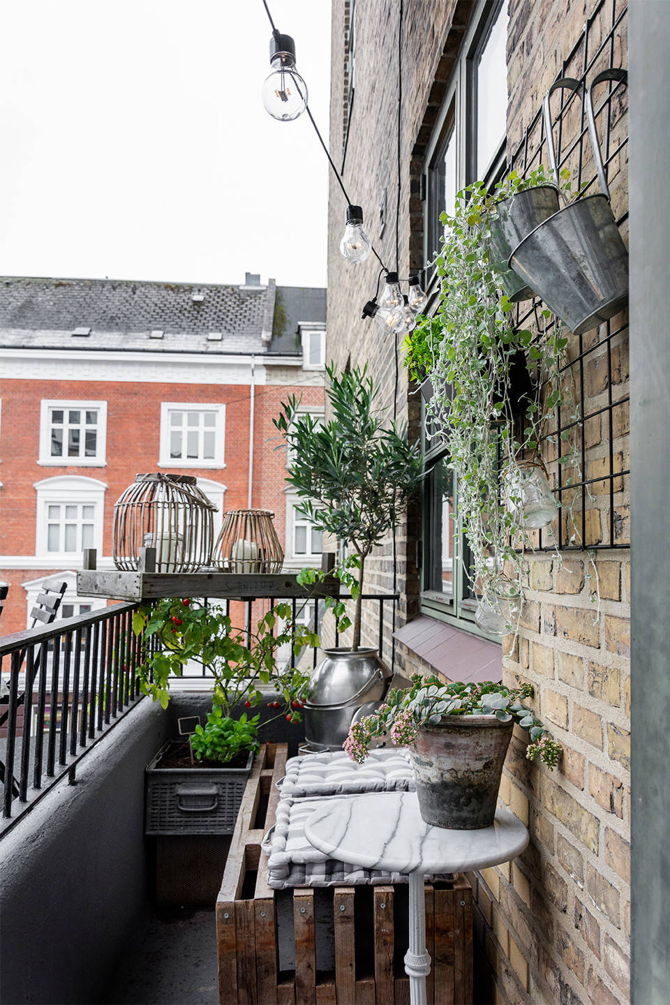 Toujours en Suède, pour pallier la structure assez simple de ce balcon, une attention particulière a été portée aux détails. Panneaux grillagés pour accrocher des vases décoratifs, textiles coordonnés, petites plantes bien placées et mobilier bien pensé, tout est fait pour que l’on s’y sente bien.