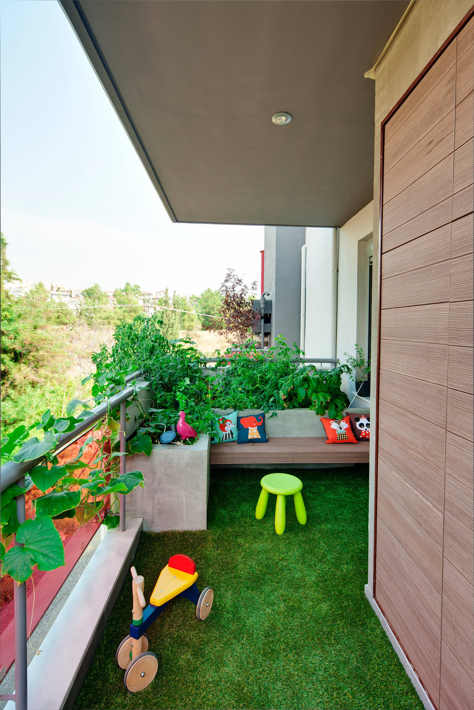 Avoir un espace extérieur sécurisé où laisser jouer les plus petits est un vrai luxe pour les parents. Pour cette raison, les propriétaires de ce petit balcon fleuri l’ont aménagé en pensant à leurs enfants. Le gazon artificiel créé un sol confortable sur lequel les chutes sont amorties et la jardinière agrémentée d’un banc de faible hauteur constitue une frontière entre le garde-corps et le balcon. Cela ne dispense évidemment pas les parents d’une surveillance permanente.