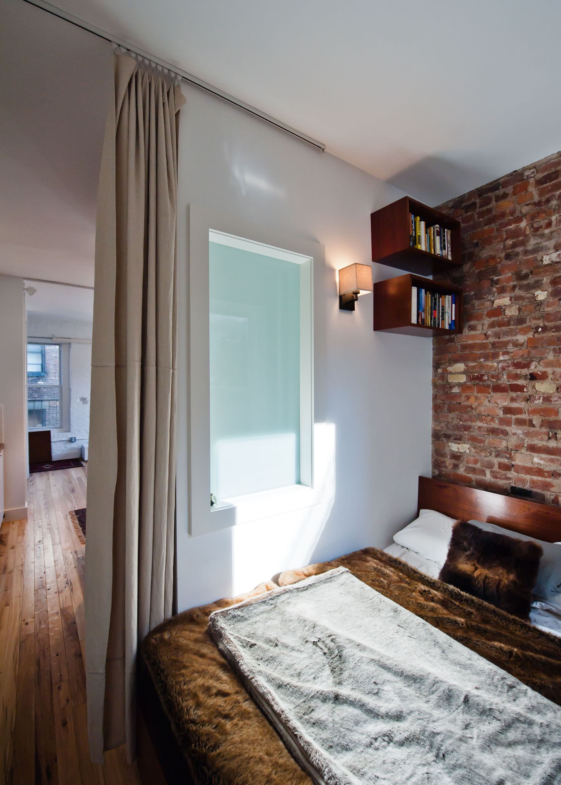 Dans cet appartement très charmant, le contraste est créé entre un mur de briques apparentes et un mur recouvert d’une peinture ardoise. Le parquet au sol vient réchauffer l’ambiance très stylée.