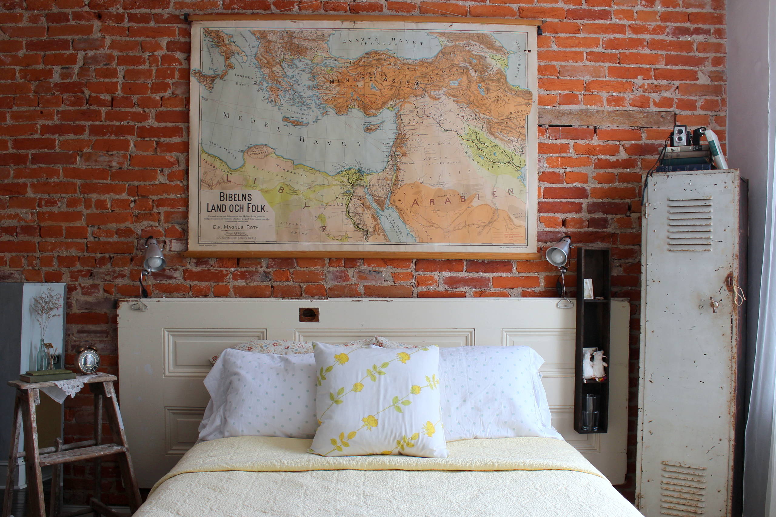 Avec son mur de briques placé derrière le lit, sa tête-de-lit confectionnée à partir d’une vieille porte, son linge de lit romantique, son escabeau récup’ et son armoire industrielle, cette chambre nous sourit… Et c’est réciproque !