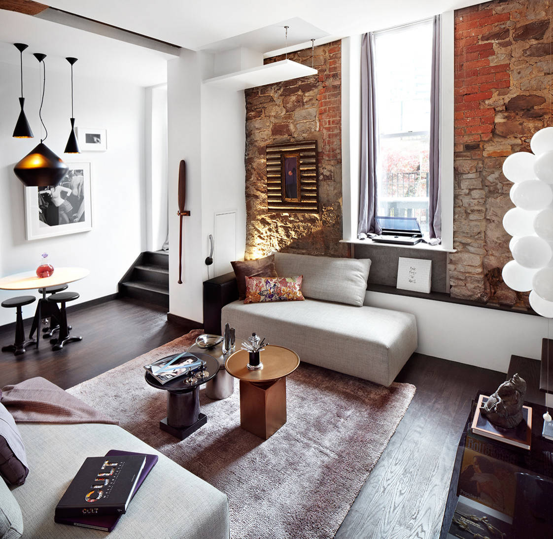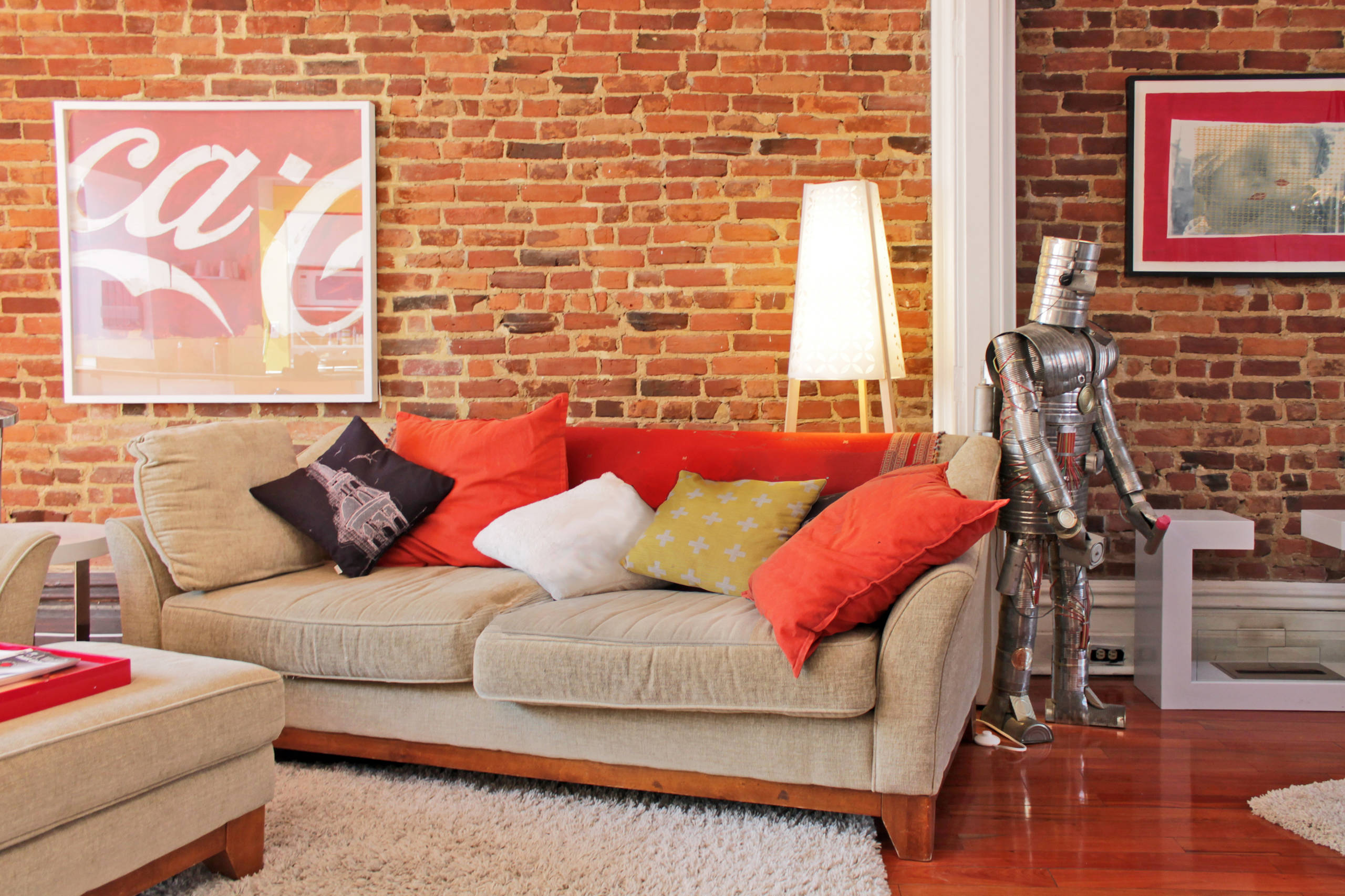 Astuce : pour réchauffer une atmosphère un peu trop industrielle amenée par des murs de briques apparentes, optez pour des canapés et fauteuils aux tissus chaleureux, comme le velours par exemple. Recouvrez-les de coussins et installez des tapis au sol.