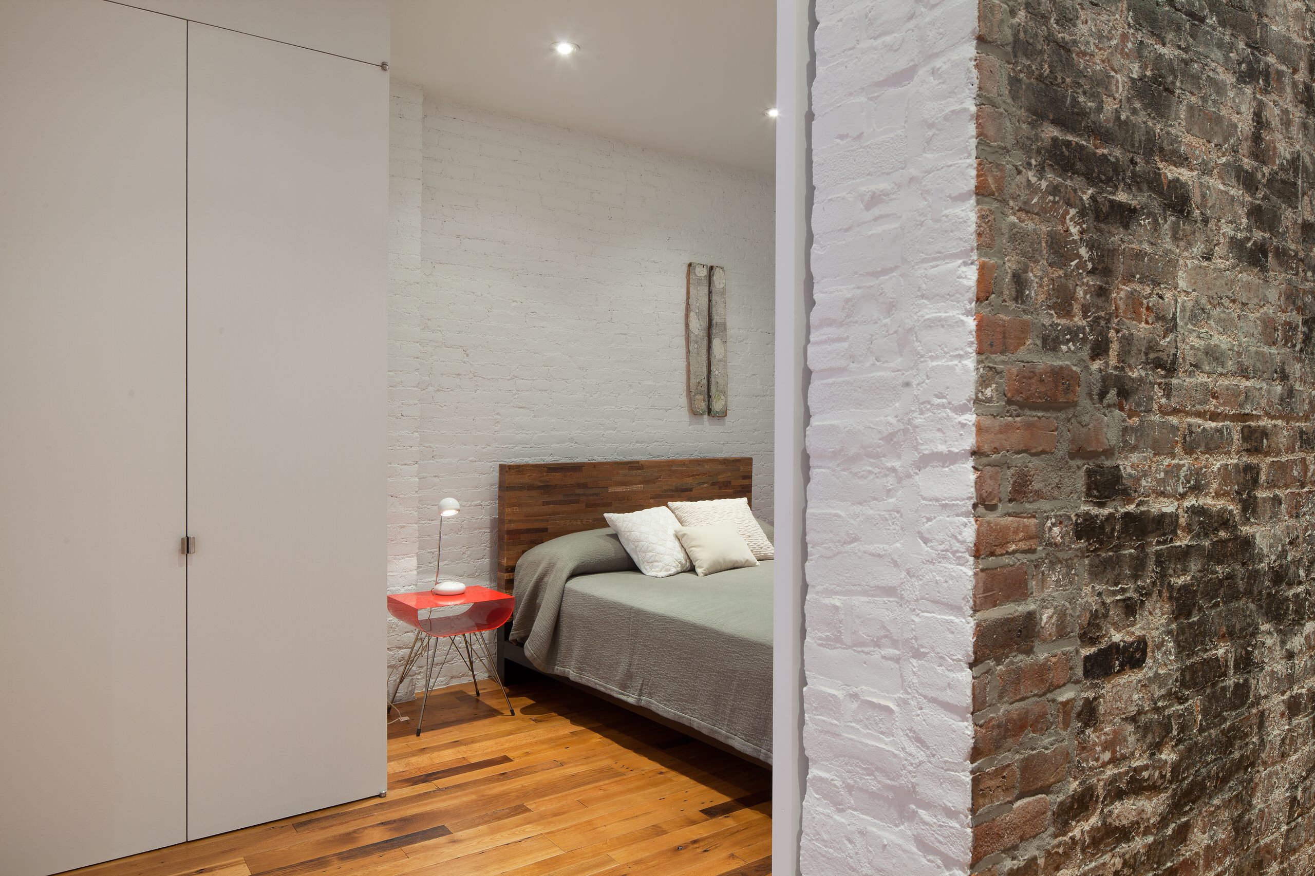Cette chambre profite également de la douceur et de la zénitude générées par la couleur blanche. En revanche, dans le couloir, pas question d’ôter le caractère séduisant du côté brut de la brique. C’est aussi l’occasion de donner du style à l’architecture grâce à ce duo percutant.