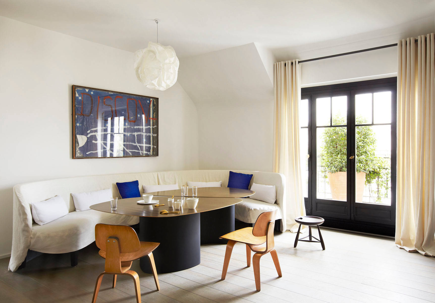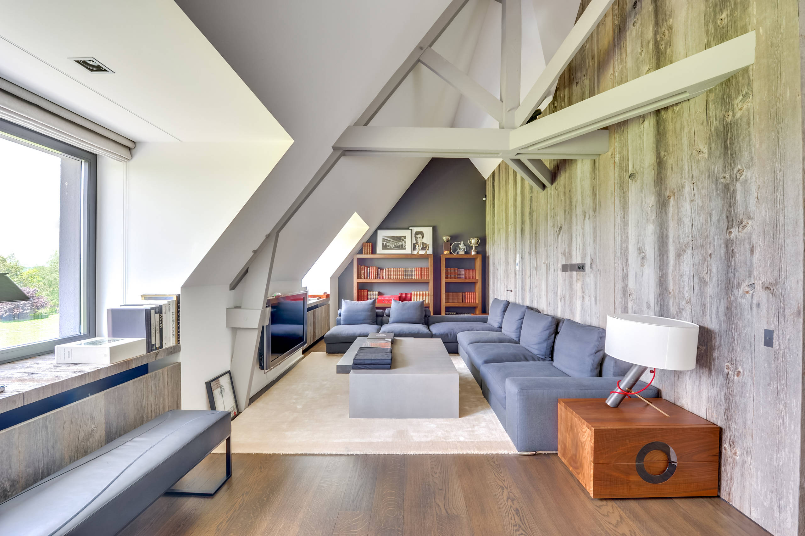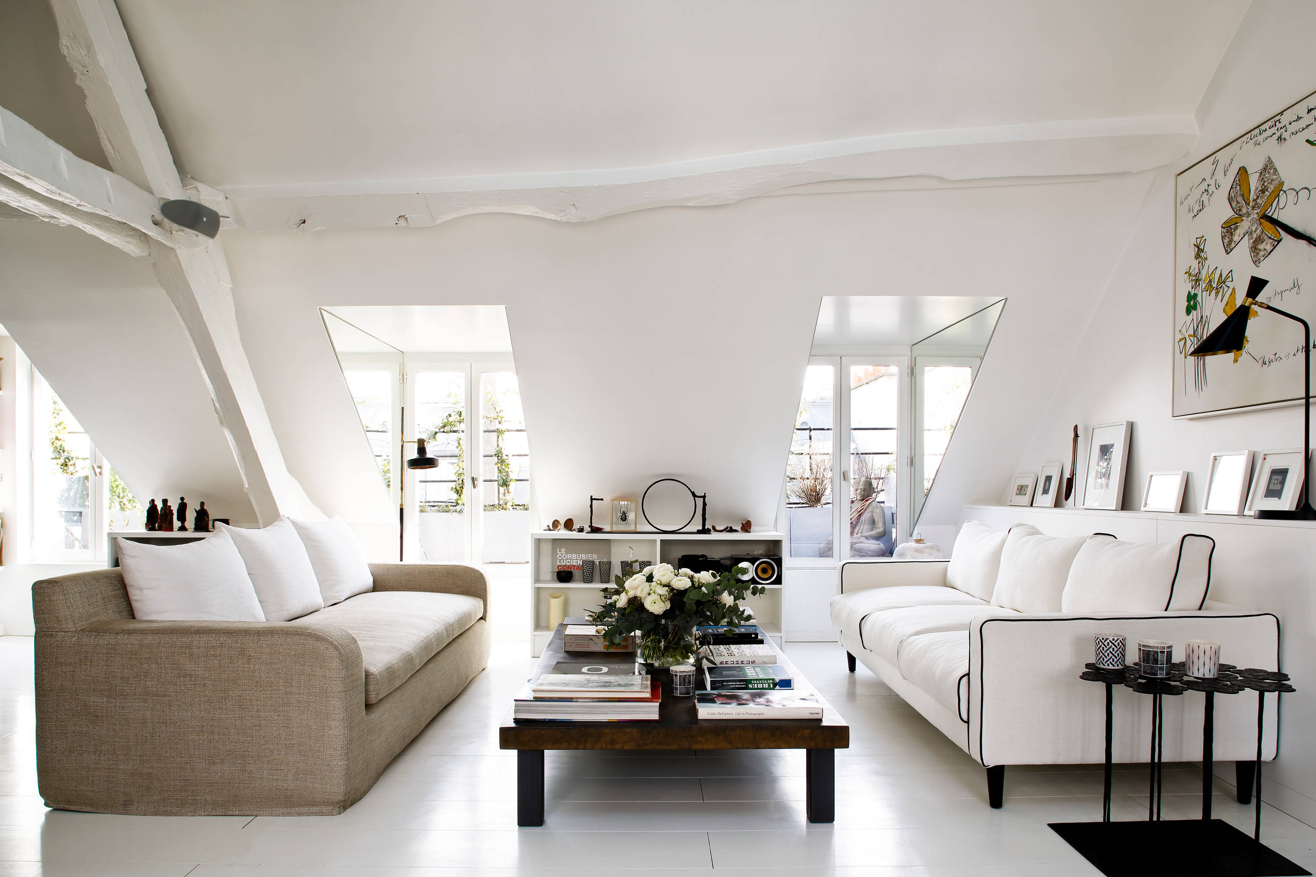 Dans une pièce carrée, deux canapés en vis-à-vis structurent les volumes et démultiplient sans trop d’encombrement les assises. Dans ce duplex parisien, l’emplacement des canapés épouse la structure de la pièce sous les combles.