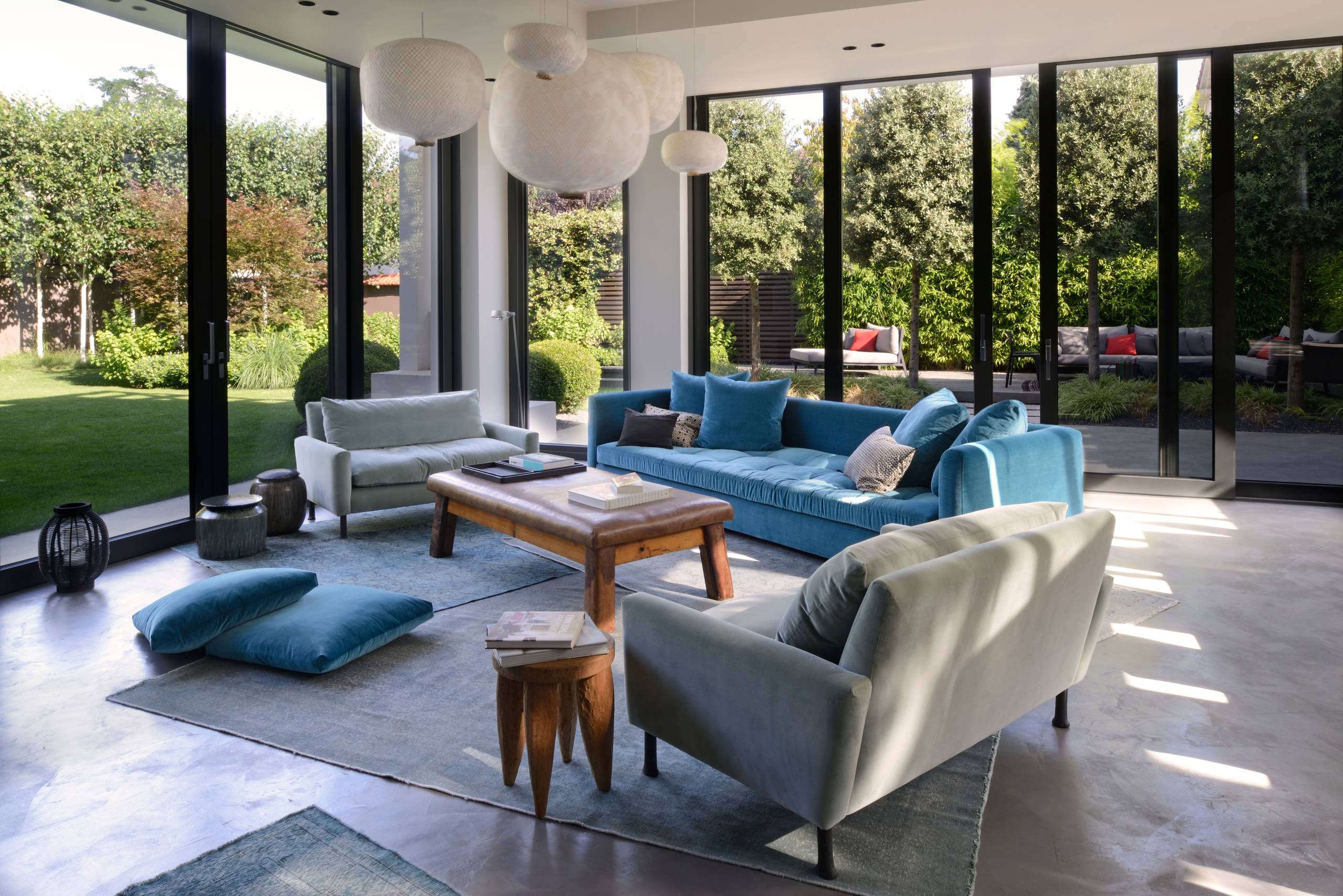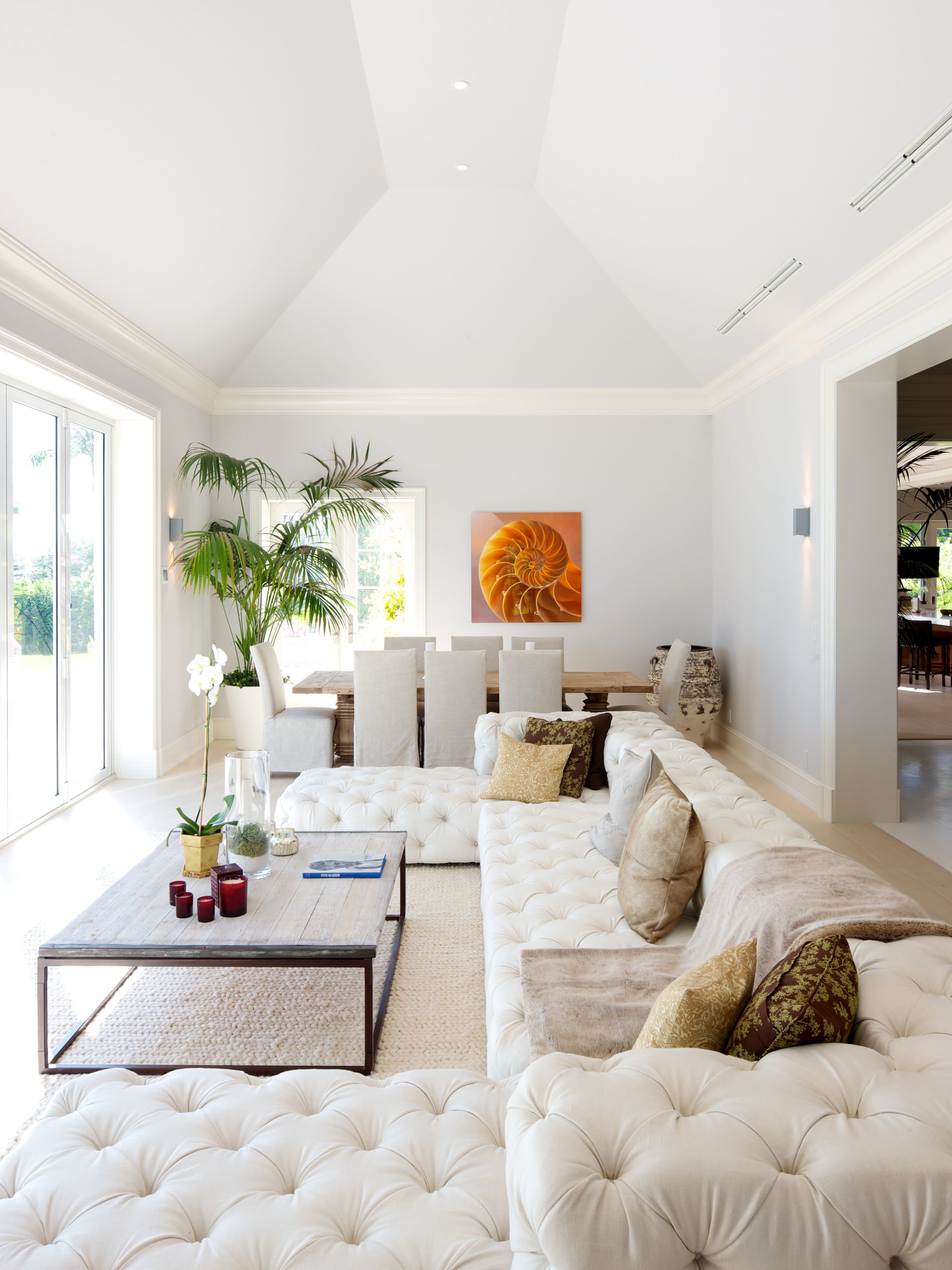 Dans une pièce rectangulaire, mettez en valeur le format spécifique de l’espace. À l’instar de ce salon à Miami, qui mise sur un canapé à double méridienne de faible hauteur, pour prolonger la vue sans heurt sur le jardin.