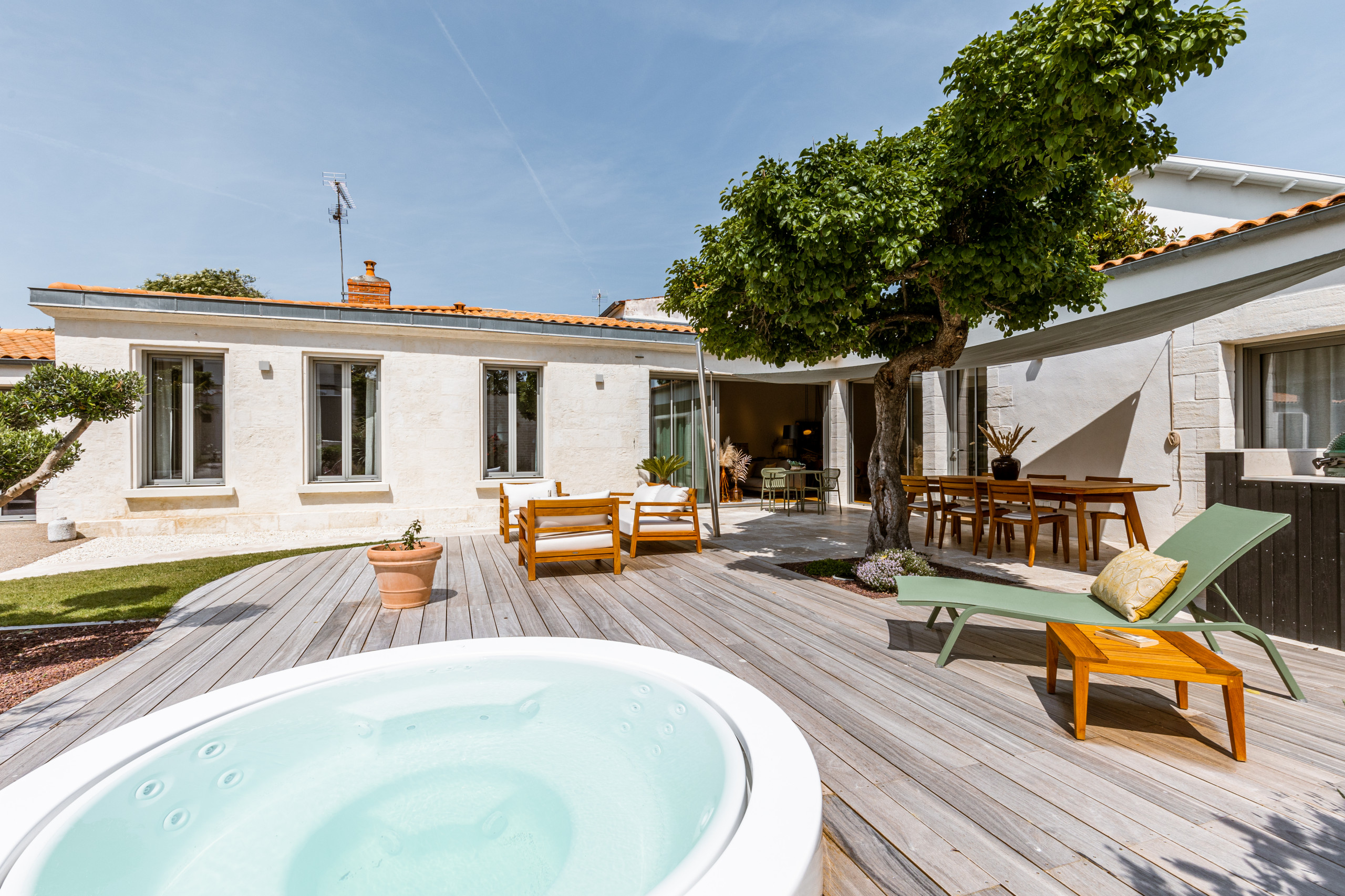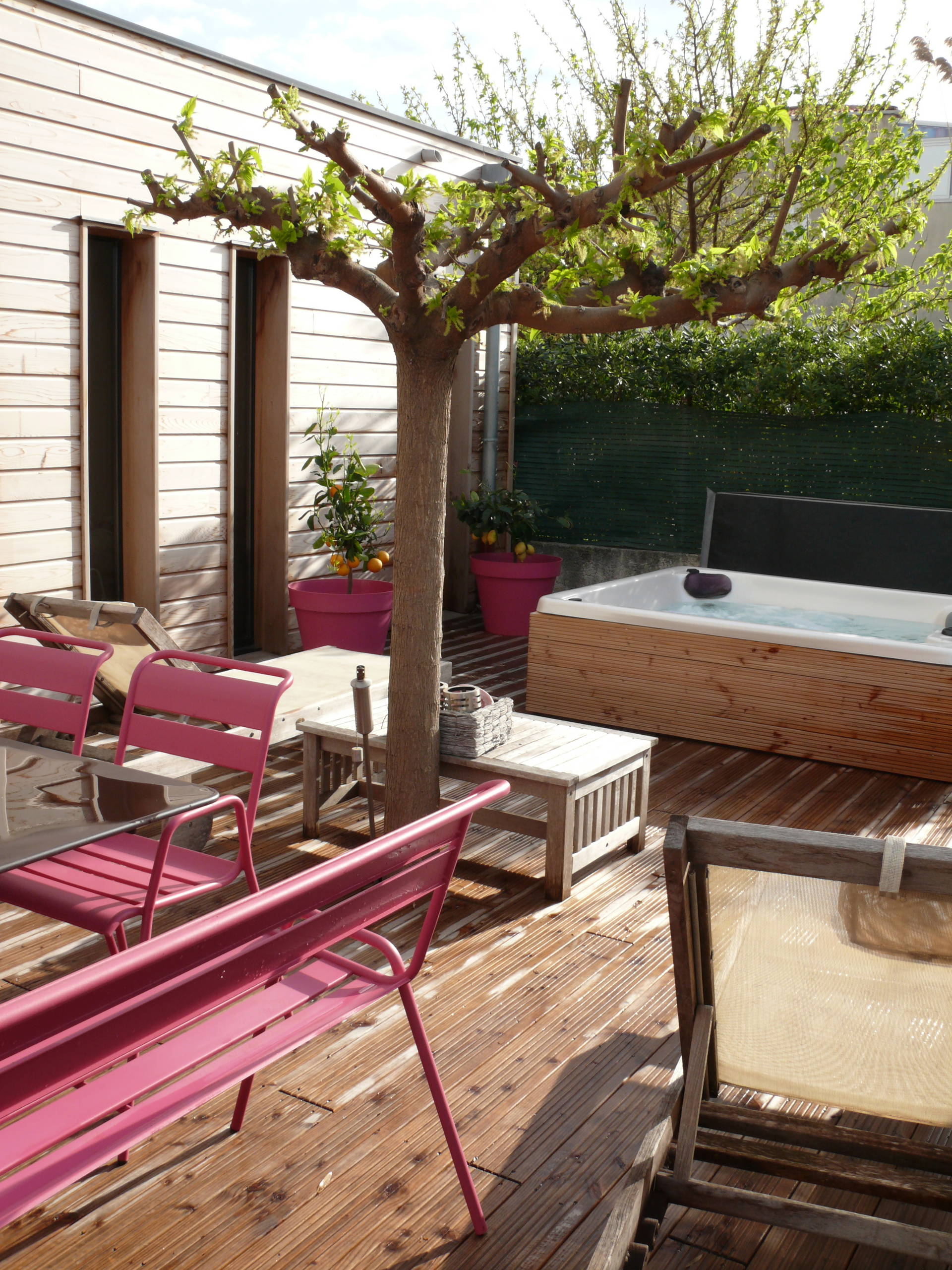 Après. La création du bassins a nécessité de rehausser une partie de la terrasse pour encastrer la coque, limitant la circulation depuis la porte-fenêtre de la chambre d’ami. Les propriétaires ont pleinement validé cette solution. Ce modèle de chez Idéal Spa est électrique et muni d’un corps de chauffe intégré sous la terrasse. Avec ses buses immergées, il offre un bouillonnement continu ou une fonction massage relaxante. Jusqu’à quatre personnes peuvent s’y installer pour des apéros très conviviaux. « Nous nous sommes tout de suite orientés vers un spa de type Jacuzzi car il chauffe vite et permet une température d’eau élevée, ce qui était nécessaire ici, compte tenu de l’ombrage », explique Claire Delahaye.